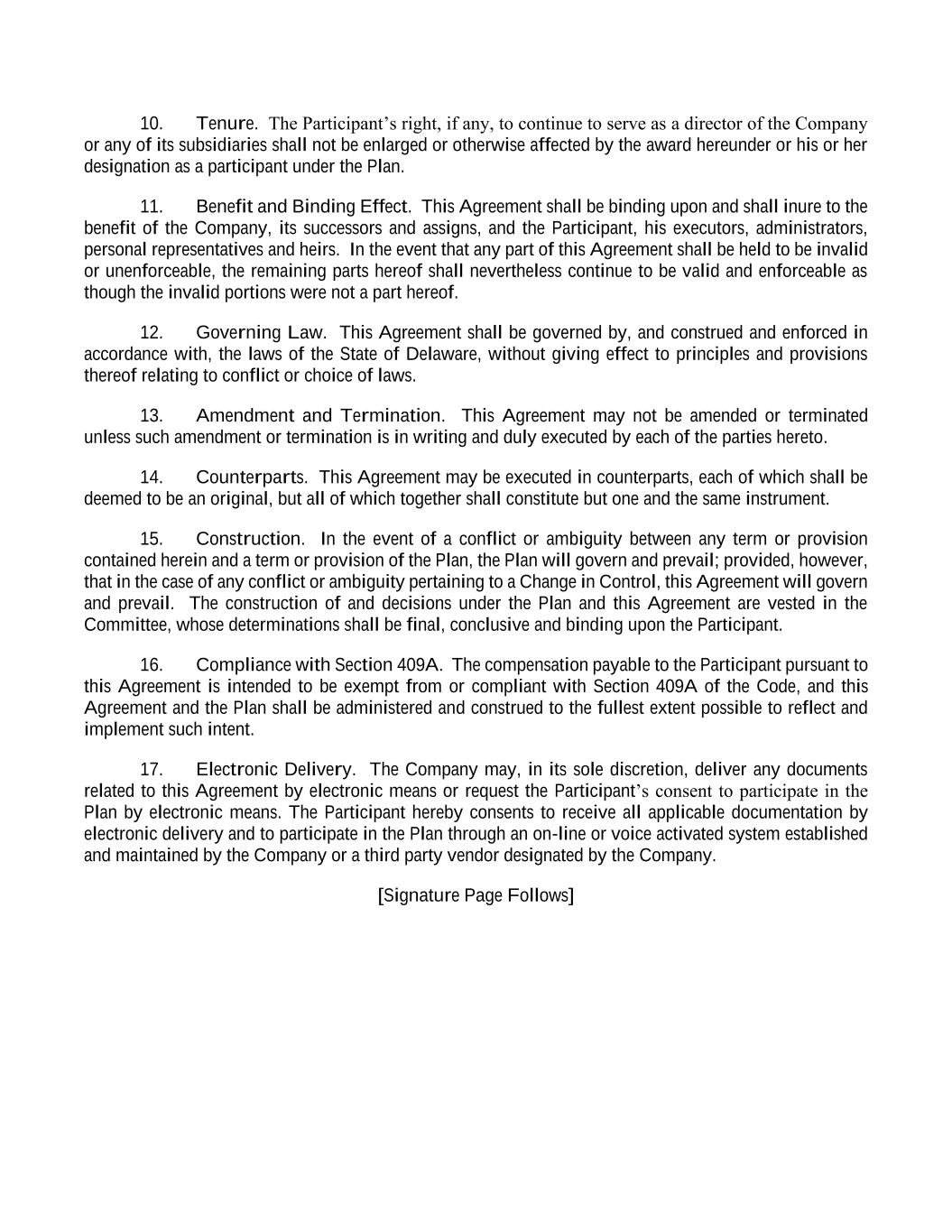 10. Tenure. The Participant’s right, if any, to continue to serve as a director of the Company or any of its subsidiaries shall not be enlarged or otherwise affected by the award hereunder or his or her designation as a participant under the Plan. 11. Benefit and Binding Effect. This Agreement shall be binding upon and shall inure to the benefit of the Company, its successors and assigns, and the Participant, his executors, administrators, personal representatives and heirs. In the event that any part of this Agreement shall be held to be invalid or unenforceable, the remaining parts hereof shall nevertheless continue to be valid and enforceable as though the invalid portions were not a part hereof. 12. Governing Law. This Agreement shall be governed by, and construed and enforced in accordance with, the laws of the State of Delaware, without giving effect to principles and provisions thereof relating to conflict or choice of laws. 13. Amendment and Termination. This Agreement may not be amended or terminated unless such amendment or termination is in writing and duly executed by each of the parties hereto. 14. Counterparts. This Agreement may be executed in counterparts, each of which shall be deemed to be an original, but all of which together shall constitute but one and the same instrument. 15. Construction. In the event of a conflict or ambiguity between any term or provision contained herein and a term or provision of the Plan, the Plan will govern and prevail; provided, however, that in the case of any conflict or ambiguity pertaining to a Change in Control, this Agreement will govern and prevail. The construction of and decisions under the Plan and this Agreement are vested in the Committee, whose determinations shall be final, conclusive and binding upon the Participant. 16. Compliance with Section 409A. The compensation payable to the Participant pursuant to this Agreement is intended to be exempt from or compliant with Section 409A of the Code, and this Agreement and the Plan shall be administered and construed to the fullest extent possible to reflect and implement such intent. 17. Electronic Delivery. The Company may, in its sole discretion, deliver any documents related to this Agreement by electronic means or request the Participant’s consent to participate in the Plan by electronic means. The Participant hereby consents to receive all applicable documentation by electronic delivery and to participate in the Plan through an on-line or voice activated system established and maintained by the Company or a third party vendor designated by the Company. [Signature Page Follows]