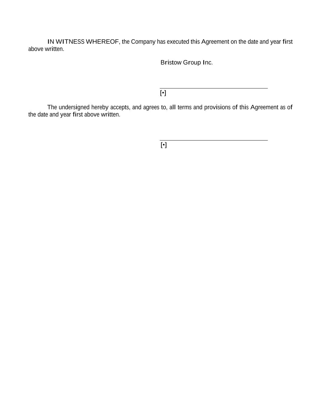 IN WITNESS WHEREOF, the Company has executed this Agreement on the date and year first above written. Bristow Group Inc. [•] The undersigned hereby accepts, and agrees to, all terms and provisions of this Agreement as of the date and year first above written. [•]