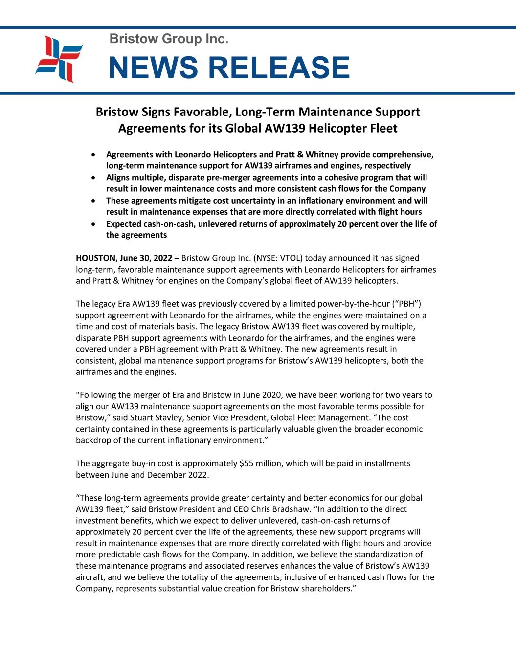 Bristow Group Inc. NEWS RELEASE Bristow Signs Favorable, Long-Term Maintenance Support Agreements for its Global AW139 Helicopter Fleet • Agreements with Leonardo Helicopters and Pratt & Whitney provide comprehensive, long-term maintenance support for AW139 airframes and engines, respectively • Aligns multiple, disparate pre-merger agreements into a cohesive program that will result in lower maintenance costs and more consistent cash flows for the Company • These agreements mitigate cost uncertainty in an inflationary environment and will result in maintenance expenses that are more directly correlated with flight hours • Expected cash-on-cash, unlevered returns of approximately 20 percent over the life of the agreements HOUSTON, June 30, 2022 – Bristow Group Inc. (NYSE: VTOL) today announced it has signed long-term, favorable maintenance support agreements with Leonardo Helicopters for airframes and Pratt & Whitney for engines on the Company’s global fleet of AW139 helicopters. The legacy Era AW139 fleet was previously covered by a limited power-by-the-hour (“PBH”) support agreement with Leonardo for the airframes, while the engines were maintained on a time and cost of materials basis. The legacy Bristow AW139 fleet was covered by multiple, disparate PBH support agreements with Leonardo for the airframes, and the engines were covered under a PBH agreement with Pratt & Whitney. The new agreements result in consistent, global maintenance support programs for Bristow’s AW139 helicopters, both the airframes and the engines. “Following the merger of Era and Bristow in June 2020, we have been working for two years to align our AW139 maintenance support agreements on the most favorable terms possible for Bristow,” said Stuart Stavley, Senior Vice President, Global Fleet Management. “The cost certainty contained in these agreements is particularly valuable given the broader economic backdrop of the current inflationary environment.” The aggregate buy-in cost is approximately $55 million, which will be paid in installments between June and December 2022. “These long-term agreements provide greater certainty and better economics for our global AW139 fleet,” said Bristow President and CEO Chris Bradshaw. “In addition to the direct investment benefits, which we expect to deliver unlevered, cash-on-cash returns of approximately 20 percent over the life of the agreements, these new support programs will result in maintenance expenses that are more directly correlated with flight hours and provide more predictable cash flows for the Company. In addition, we believe the standardization of these maintenance programs and associated reserves enhances the value of Bristow’s AW139 aircraft, and we believe the totality of the agreements, inclusive of enhanced cash flows for the Company, represents substantial value creation for Bristow shareholders.”