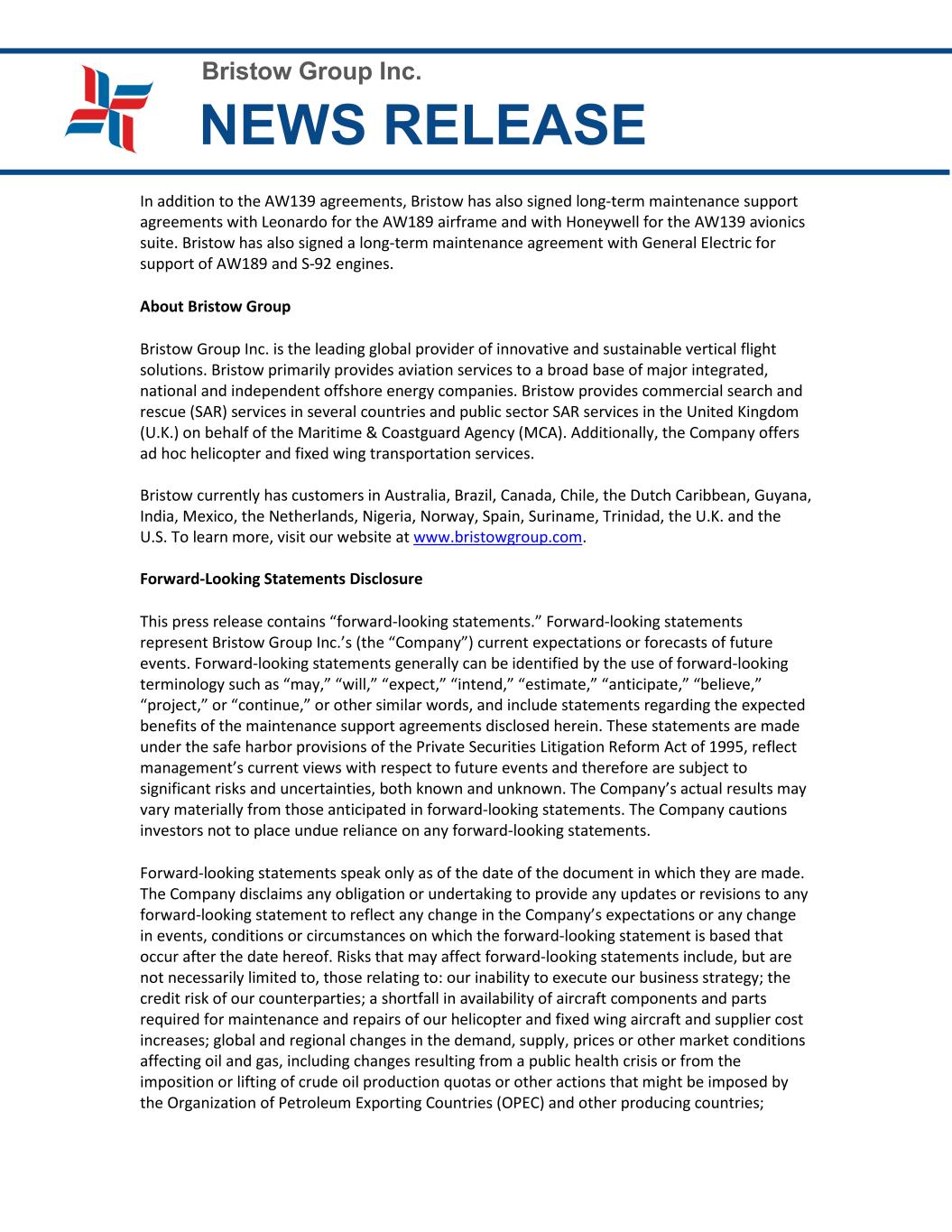 Bristow Group Inc. NEWS RELEASE In addition to the AW139 agreements, Bristow has also signed long-term maintenance support agreements with Leonardo for the AW189 airframe and with Honeywell for the AW139 avionics suite. Bristow has also signed a long-term maintenance agreement with General Electric for support of AW189 and S-92 engines. About Bristow Group Bristow Group Inc. is the leading global provider of innovative and sustainable vertical flight solutions. Bristow primarily provides aviation services to a broad base of major integrated, national and independent offshore energy companies. Bristow provides commercial search and rescue (SAR) services in several countries and public sector SAR services in the United Kingdom (U.K.) on behalf of the Maritime & Coastguard Agency (MCA). Additionally, the Company offers ad hoc helicopter and fixed wing transportation services. Bristow currently has customers in Australia, Brazil, Canada, Chile, the Dutch Caribbean, Guyana, India, Mexico, the Netherlands, Nigeria, Norway, Spain, Suriname, Trinidad, the U.K. and the U.S. To learn more, visit our website at www.bristowgroup.com. Forward-Looking Statements Disclosure This press release contains “forward-looking statements.” Forward-looking statements represent Bristow Group Inc.’s (the “Company”) current expectations or forecasts of future events. Forward-looking statements generally can be identified by the use of forward-looking terminology such as “may,” “will,” “expect,” “intend,” “estimate,” “anticipate,” “believe,” “project,” or “continue,” or other similar words, and include statements regarding the expected benefits of the maintenance support agreements disclosed herein. These statements are made under the safe harbor provisions of the Private Securities Litigation Reform Act of 1995, reflect management’s current views with respect to future events and therefore are subject to significant risks and uncertainties, both known and unknown. The Company’s actual results may vary materially from those anticipated in forward-looking statements. The Company cautions investors not to place undue reliance on any forward-looking statements. Forward-looking statements speak only as of the date of the document in which they are made. The Company disclaims any obligation or undertaking to provide any updates or revisions to any forward-looking statement to reflect any change in the Company’s expectations or any change in events, conditions or circumstances on which the forward-looking statement is based that occur after the date hereof. Risks that may affect forward-looking statements include, but are not necessarily limited to, those relating to: our inability to execute our business strategy; the credit risk of our counterparties; a shortfall in availability of aircraft components and parts required for maintenance and repairs of our helicopter and fixed wing aircraft and supplier cost increases; global and regional changes in the demand, supply, prices or other market conditions affecting oil and gas, including changes resulting from a public health crisis or from the imposition or lifting of crude oil production quotas or other actions that might be imposed by the Organization of Petroleum Exporting Countries (OPEC) and other producing countries;