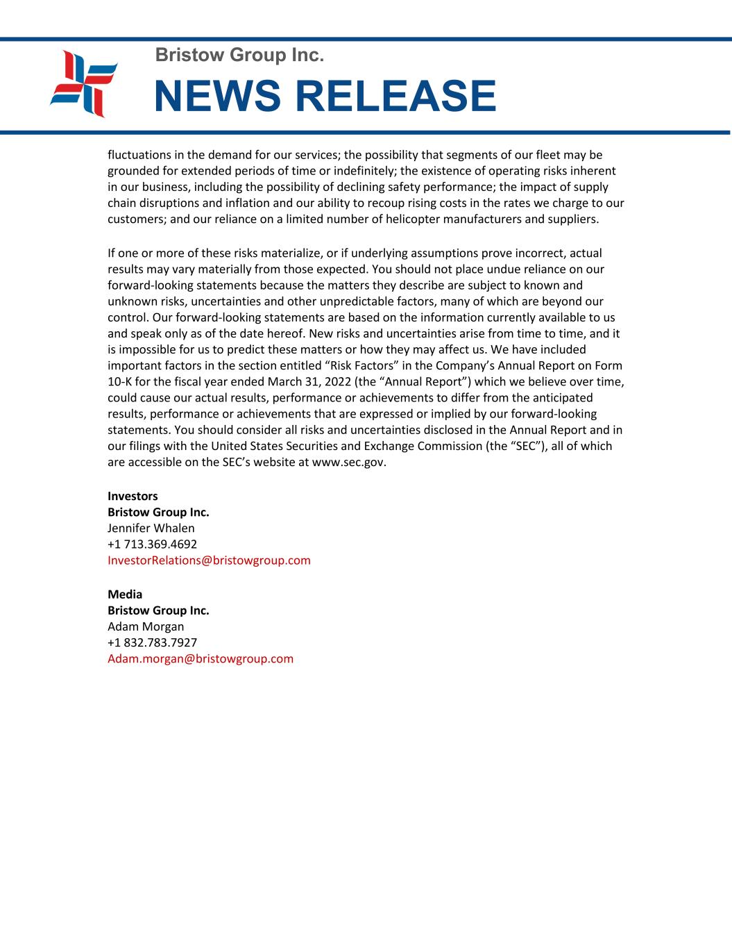 Bristow Group Inc. NEWS RELEASE fluctuations in the demand for our services; the possibility that segments of our fleet may be grounded for extended periods of time or indefinitely; the existence of operating risks inherent in our business, including the possibility of declining safety performance; the impact of supply chain disruptions and inflation and our ability to recoup rising costs in the rates we charge to our customers; and our reliance on a limited number of helicopter manufacturers and suppliers. If one or more of these risks materialize, or if underlying assumptions prove incorrect, actual results may vary materially from those expected. You should not place undue reliance on our forward-looking statements because the matters they describe are subject to known and unknown risks, uncertainties and other unpredictable factors, many of which are beyond our control. Our forward-looking statements are based on the information currently available to us and speak only as of the date hereof. New risks and uncertainties arise from time to time, and it is impossible for us to predict these matters or how they may affect us. We have included important factors in the section entitled “Risk Factors” in the Company’s Annual Report on Form 10-K for the fiscal year ended March 31, 2022 (the “Annual Report”) which we believe over time, could cause our actual results, performance or achievements to differ from the anticipated results, performance or achievements that are expressed or implied by our forward-looking statements. You should consider all risks and uncertainties disclosed in the Annual Report and in our filings with the United States Securities and Exchange Commission (the “SEC”), all of which are accessible on the SEC’s website at www.sec.gov. Investors Bristow Group Inc. Jennifer Whalen +1 713.369.4692 InvestorRelations@bristowgroup.com Media Bristow Group Inc. Adam Morgan +1 832.783.7927 Adam.morgan@bristowgroup.com