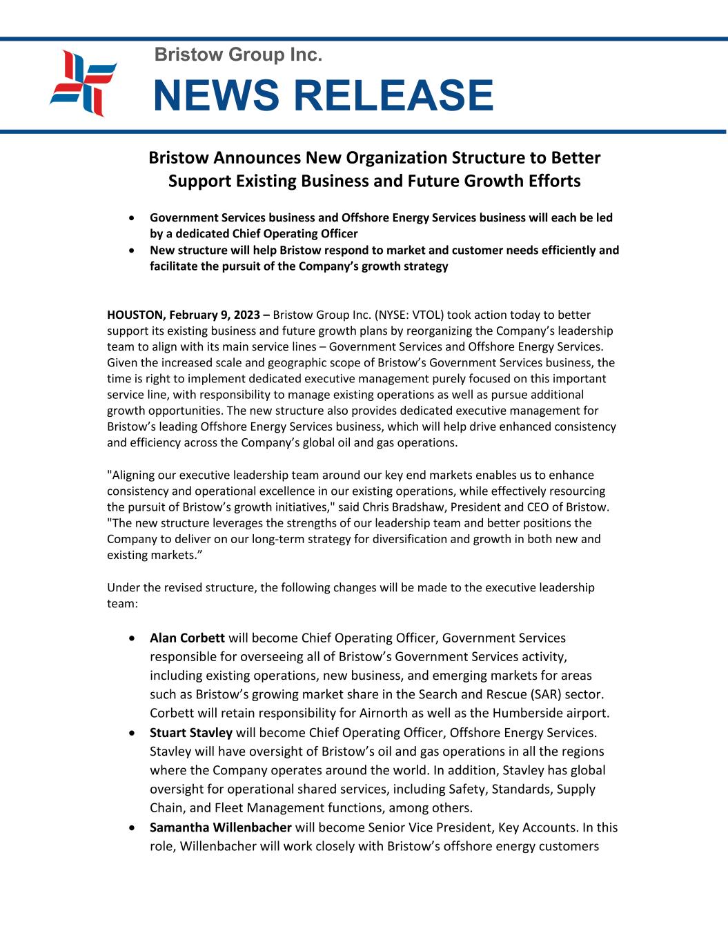 Bristow Group Inc. NEWS RELEASE Bristow Announces New Organization Structure to Better Support Existing Business and Future Growth Efforts • Government Services business and Offshore Energy Services business will each be led by a dedicated Chief Operating Officer • New structure will help Bristow respond to market and customer needs efficiently and facilitate the pursuit of the Company’s growth strategy HOUSTON, February 9, 2023 – Bristow Group Inc. (NYSE: VTOL) took action today to better support its existing business and future growth plans by reorganizing the Company’s leadership team to align with its main service lines – Government Services and Offshore Energy Services. Given the increased scale and geographic scope of Bristow’s Government Services business, the time is right to implement dedicated executive management purely focused on this important service line, with responsibility to manage existing operations as well as pursue additional growth opportunities. The new structure also provides dedicated executive management for Bristow’s leading Offshore Energy Services business, which will help drive enhanced consistency and efficiency across the Company’s global oil and gas operations. "Aligning our executive leadership team around our key end markets enables us to enhance consistency and operational excellence in our existing operations, while effectively resourcing the pursuit of Bristow’s growth initiatives," said Chris Bradshaw, President and CEO of Bristow. "The new structure leverages the strengths of our leadership team and better positions the Company to deliver on our long-term strategy for diversification and growth in both new and existing markets.” Under the revised structure, the following changes will be made to the executive leadership team: • Alan Corbett will become Chief Operating Officer, Government Services responsible for overseeing all of Bristow’s Government Services activity, including existing operations, new business, and emerging markets for areas such as Bristow’s growing market share in the Search and Rescue (SAR) sector. Corbett will retain responsibility for Airnorth as well as the Humberside airport. • Stuart Stavley will become Chief Operating Officer, Offshore Energy Services. Stavley will have oversight of Bristow’s oil and gas operations in all the regions where the Company operates around the world. In addition, Stavley has global oversight for operational shared services, including Safety, Standards, Supply Chain, and Fleet Management functions, among others. • Samantha Willenbacher will become Senior Vice President, Key Accounts. In this role, Willenbacher will work closely with Bristow’s offshore energy customers