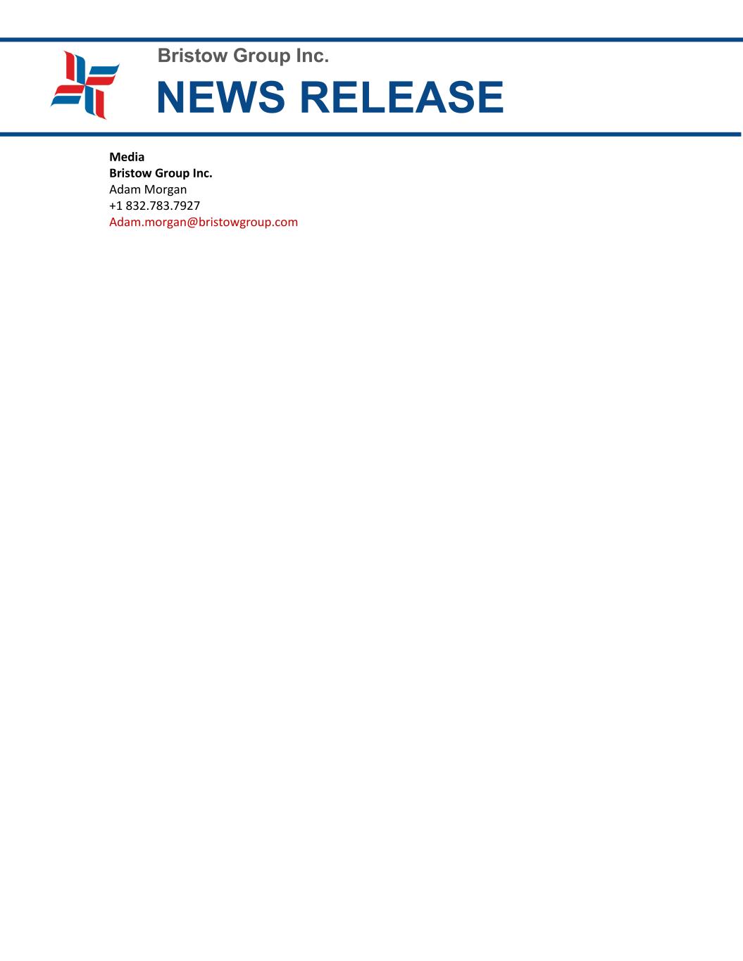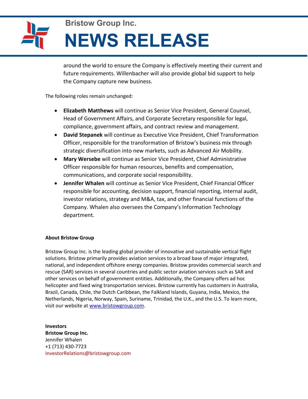 Bristow Group Inc. NEWS RELEASE around the world to ensure the Company is effectively meeting their current and future requirements. Willenbacher will also provide global bid support to help the Company capture new business. The following roles remain unchanged: • Elizabeth Matthews will continue as Senior Vice President, General Counsel, Head of Government Affairs, and Corporate Secretary responsible for legal, compliance, government affairs, and contract review and management. • David Stepanek will continue as Executive Vice President, Chief Transformation Officer, responsible for the transformation of Bristow’s business mix through strategic diversification into new markets, such as Advanced Air Mobility. • Mary Wersebe will continue as Senior Vice President, Chief Administrative Officer responsible for human resources, benefits and compensation, communications, and corporate social responsibility. • Jennifer Whalen will continue as Senior Vice President, Chief Financial Officer responsible for accounting, decision support, financial reporting, internal audit, investor relations, strategy and M&A, tax, and other financial functions of the Company. Whalen also oversees the Company’s Information Technology department. About Bristow Group Bristow Group Inc. is the leading global provider of innovative and sustainable vertical flight solutions. Bristow primarily provides aviation services to a broad base of major integrated, national, and independent offshore energy companies. Bristow provides commercial search and rescue (SAR) services in several countries and public sector aviation services such as SAR and other services on behalf of government entities. Additionally, the Company offers ad hoc helicopter and fixed wing transportation services. Bristow currently has customers in Australia, Brazil, Canada, Chile, the Dutch Caribbean, the Falkland Islands, Guyana, India, Mexico, the Netherlands, Nigeria, Norway, Spain, Suriname, Trinidad, the U.K., and the U.S. To learn more, visit our website at www.bristowgroup.com. Investors Bristow Group Inc. Jennifer Whalen +1 (713) 430-7723 InvestorRelations@bristowgroup.com