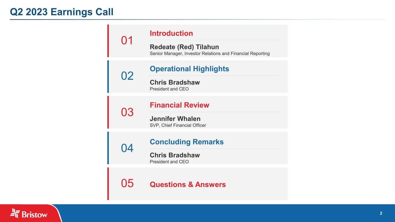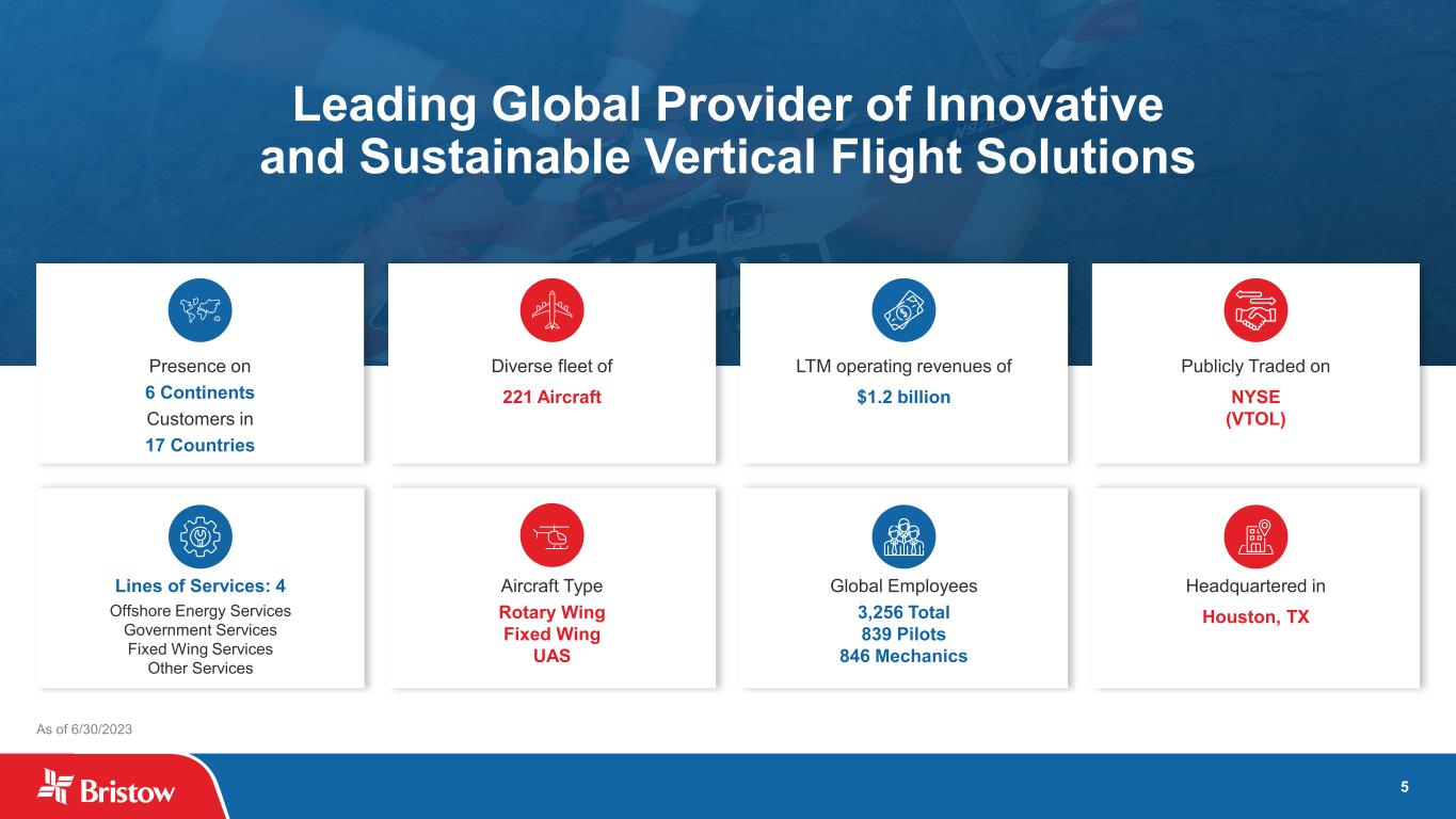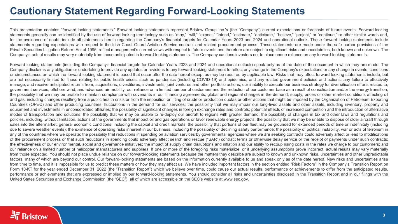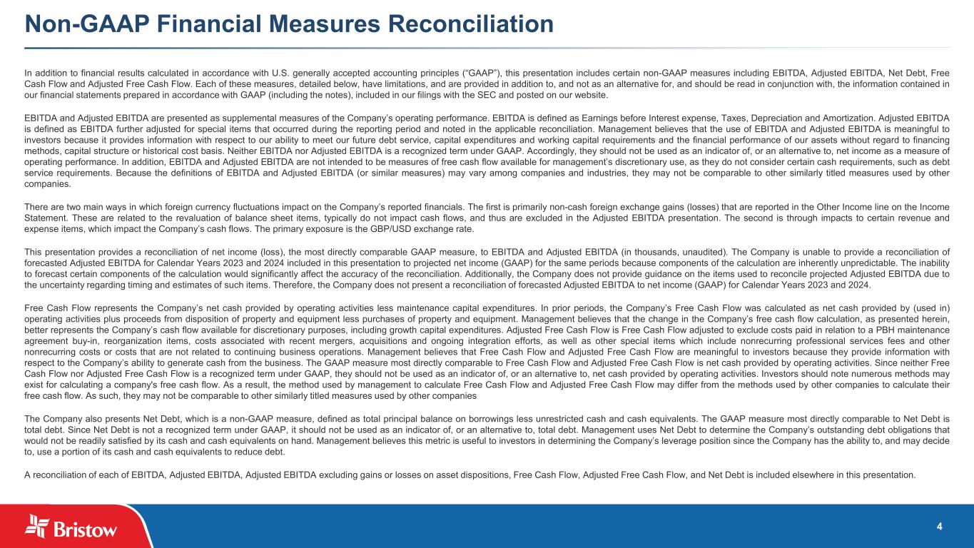 3 Cautionary Statement Regarding Forward-Looking Statements This presentation contains “forward-looking statements.” Forward-looking statements represent Bristow Group Inc.’s (the “Company”) current expectations or forecasts of future events. Forward-looking statements generally can be identified by the use of forward-looking terminology such as “may,” “will,” “expect,” “intend,” “estimate,” “anticipate,” “believe,” “project,” or “continue,” or other similar words and, for the avoidance of doubt, include all statements herein regarding the Company's financial targets for Calendar Years 2023 and 2024 and operational outlook. These forward-looking statements include statements regarding expectations with respect to the Irish Coast Guard Aviation Service contract and related procurement process. These statements are made under the safe harbor provisions of the Private Securities Litigation Reform Act of 1995, reflect management’s current views with respect to future events and therefore are subject to significant risks and uncertainties, both known and unknown. The Company’s actual results may vary materially from those anticipated in forward-looking statements. The Company cautions investors not to place undue reliance on any forward-looking statements. Forward-looking statements (including the Company's financial targets for Calendar Years 2023 and 2024 and operational outlook) speak only as of the date of the document in which they are made. The Company disclaims any obligation or undertaking to provide any updates or revisions to any forward-looking statement to reflect any change in the Company’s expectations or any change in events, conditions or circumstances on which the forward-looking statement is based that occur after the date hereof except as may be required by applicable law. Risks that may affect forward-looking statements include, but are not necessarily limited to, those relating to: public health crises, such as pandemics (including COVID-19) and epidemics, and any related government policies and actions; any failure to effectively manage, and receive anticipated returns from, acquisitions, divestitures, investments, joint ventures and other portfolio actions; our inability to execute our business strategy for diversification efforts related to, government services, offshore wind, and advanced air mobility; our reliance on a limited number of customers and the reduction of our customer base as a result of consolidation and/or the energy transition; the possibility that we may be unable to maintain compliance with covenants in our financing agreements; global and regional changes in the demand, supply, prices or other market conditions affecting oil and gas, including changes resulting from a public health crisis or from the imposition or lifting of crude oil production quotas or other actions that might be imposed by the Organization of Petroleum Exporting Countries (OPEC) and other producing countries; fluctuations in the demand for our services; the possibility that we may impair our long-lived assets and other assets, including inventory, property and equipment and investments in unconsolidated affiliates; the possibility of significant changes in foreign exchange rates and controls; potential effects of increased competition and the introduction of alternative modes of transportation and solutions; the possibility that we may be unable to re-deploy our aircraft to regions with greater demand; the possibility of changes in tax and other laws and regulations and policies, including, without limitation, actions of the governments that impact oil and gas operations or favor renewable energy projects; the possibility that we may be unable to dispose of older aircraft through sales into the aftermarket; general economic conditions, including the capital and credit markets; the possibility that portions of our fleet may be grounded for extended periods of time or indefinitely (including due to severe weather events); the existence of operating risks inherent in our business, including the possibility of declining safety performance; the possibility of political instability, war or acts of terrorism in any of the countries where we operate; the possibility that reductions in spending on aviation services by governmental agencies where we are seeking contracts could adversely affect or lead to modifications of the procurement process or that such reductions in spending could adversely affect search and rescue (“SAR”) contract terms or otherwise delay service or the receipt of payments under such contracts; the effectiveness of our environmental, social and governance initiatives; the impact of supply chain disruptions and inflation and our ability to recoup rising costs in the rates we charge to our customers; and our reliance on a limited number of helicopter manufacturers and suppliers. If one or more of the foregoing risks materialize, or if underlying assumptions prove incorrect, actual results may vary materially from those expected. You should not place undue reliance on our forward-looking statements because the matters they describe are subject to known and unknown risks, uncertainties and other unpredictable factors, many of which are beyond our control. Our forward-looking statements are based on the information currently available to us and speak only as of the date hereof. New risks and uncertainties arise from time to time, and it is impossible for us to predict these matters or how they may affect us. We have included important factors in the section entitled “Risk Factors” in the Company’s Transition Report on Form 10-KT for the year ended December 31, 2022 (the “Transition Report”) which we believe over time, could cause our actual results, performance or achievements to differ from the anticipated results, performance or achievements that are expressed or implied by our forward-looking statements