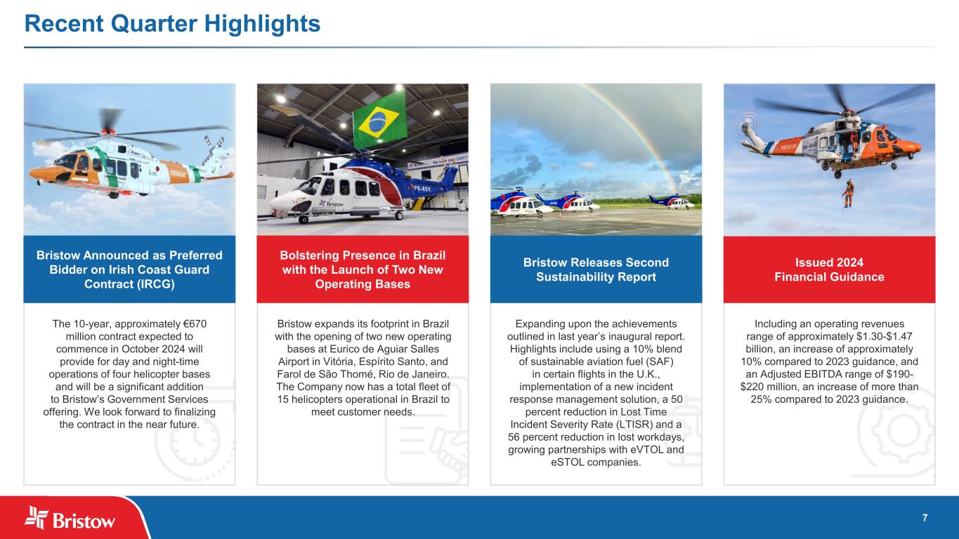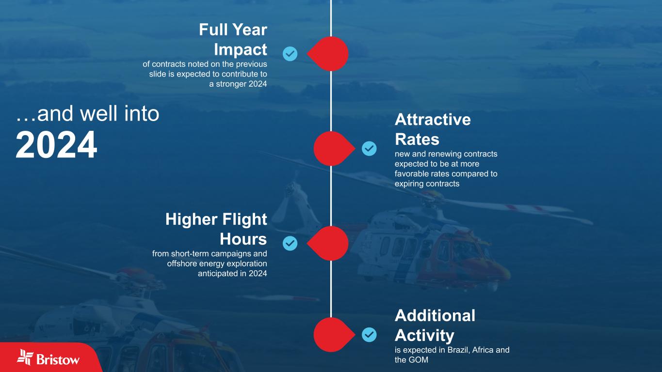 Full Year Impact of contracts noted on the previous slide is expected to contribute to a stronger 2024 Attractive Rates new and renewing contracts expected to be at more favorable rates compared to expiring contracts Higher Flight Hours from short-term campaigns and offshore energy exploration anticipated in 2024 Additional Activity is expected in Brazil, Africa and the GOM …and well into 2024