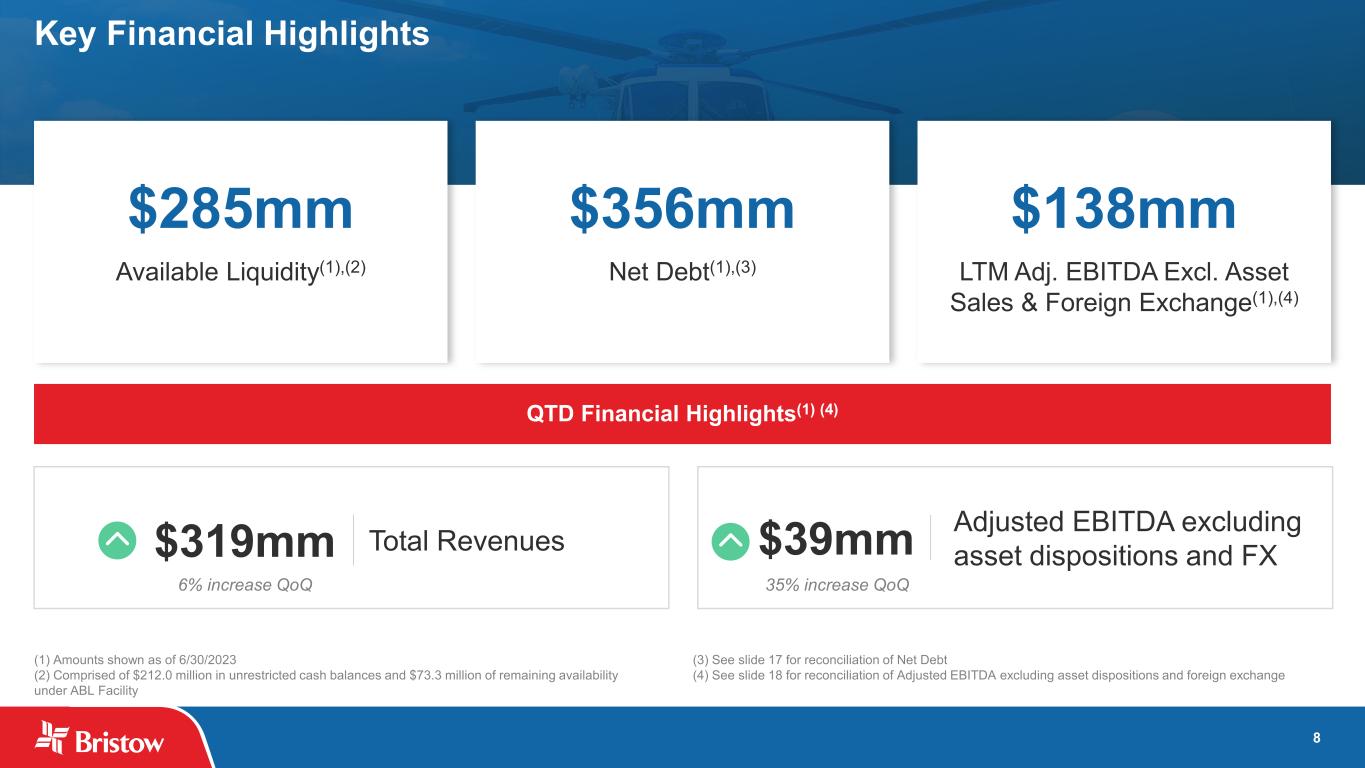 7 Recent Quarter Highlights The 10-year, approximately €670 million contract expected to commence in October 2024 will provide for day and night-time operations of four helicopter bases and will be a significant addition to Bristow’s Government Services offering. We look forward to finalizing the contract in the near future. Bristow expands its footprint in Brazil with the opening of two new operating bases at Eurico de Aguiar Salles Airport in Vitória, Espírito Santo, and Farol de São Thomé, Rio de Janeiro. The Company now has a total fleet of 15 helicopters operational in Brazil to meet customer needs. Expanding upon the achievements outlined in last year’s inaugural report. Highlights include using a 10% blend of sustainable aviation fuel (SAF) in certain flights in the U.K., implementation of a new incident response management solution, a 50 percent reduction in Lost Time Incident Severity Rate (LTISR) and a 56 percent reduction in lost workdays, growing partnerships with eVTOL and eSTOL companies. Including an operating revenues range of approximately $1.30-$1.47 billion, an increase of approximately 10% compared to 2023 guidance, and an Adjusted EBITDA range of $190- $220 million, an increase of more than 25% compared to 2023 guidance. Bristow Announced as Preferred Bidder on Irish Coast Guard Contract (IRCG) Bolstering Presence in Brazil with the Launch of Two New Operating Bases Bristow Releases Second Sustainability Report Issued 2024 Financial Guidance