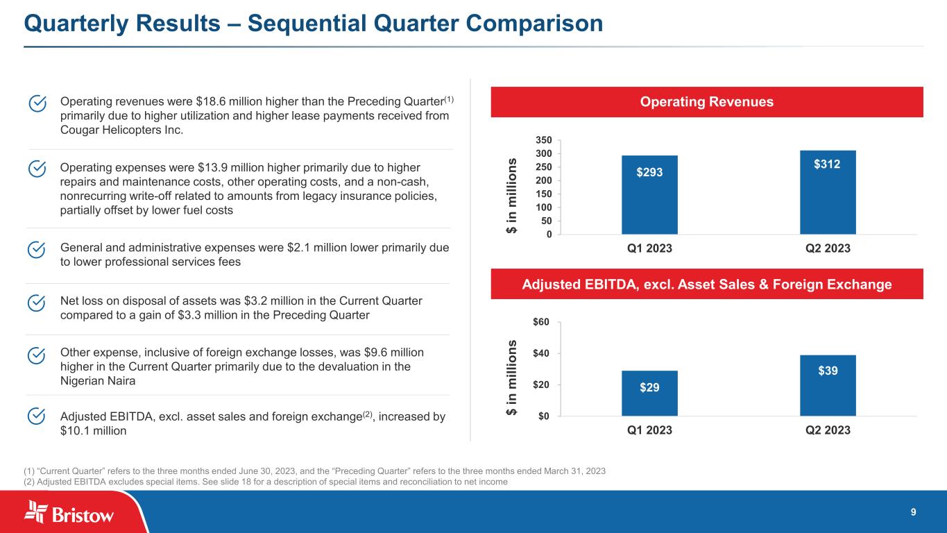 8 Key Financial Highlights (1) Amounts shown as of 6/30/2023 (2) Comprised of $212.0 million in unrestricted cash balances and $73.3 million of remaining availability under ABL Facility (3) See 17 for reconciliation of Net Debt (4) See 18 for reconciliation of Adjusted EBITDA excluding asset dispositions and foreign exchange slide slide $285mm Available Liquidity(1),(2) QTD Financial Highlights(1) (4) $356mm Net Debt(1),(3) $138mm LTM Adj. EBITDA Excl. Asset Sales & Foreign Exchange(1),(4) $39mm Adjusted EBITDA excluding asset dispositions and FX 35% increase QoQ6% increase QoQ $319mm Total Revenues