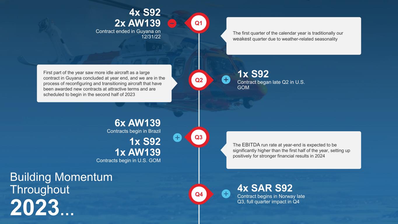 Q1 Q2 Q3 Q4 4x S92 2x AW139 Contract ended in Guyana on 12/31/22 1x S92 Contract began late Q2 in U.S. GOM 6x AW139 Contracts begin in Brazil 1x S92 1x AW139 Contracts begin in U.S. GOM 4x SAR S92 Contract begins in Norway late Q3, full quarter impact in Q4 The first quarter of the calendar year is traditionally our weakest quarter due to weather-related seasonality First part of the year saw more idle aircraft as a large contract in Guyana concluded at year end, and we are in the process of reconfiguring and transitioning aircraft that have been awarded new contracts at attractive terms and are scheduled to begin in the second half of 2023 The EBITDA run rate at year-end is expected to be significantly higher than the first half of the year, setting up positively for stronger financial results in 2024 Building Momentum Throughout 2023…