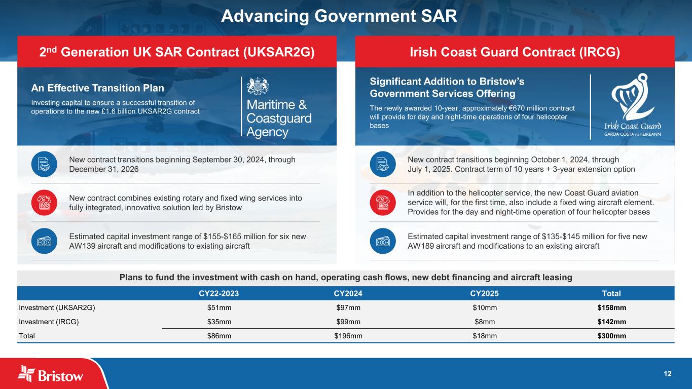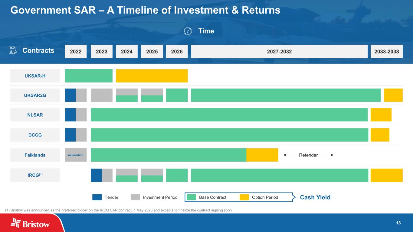12 An Effective Transition Plan Investing capital to ensure a successful transition of operations to the new £1.6 billion UKSAR2G contract Significant Addition to Bristow’s Government Services Offering The newly awarded 10-year, approximately €670 million contract will provide for day and night-time operations of four helicopter bases New contract transitions beginning September 30, 2024, through December 31, 2026 Estimated capital investment range of $155-$165 million for six new AW139 aircraft and modifications to existing aircraft New contract combines existing rotary and fixed wing services into fully integrated, innovative solution led by Bristow New contract transitions beginning October 1, 2024, through July 1, 2025. Contract term of 10 years + 3-year extension option Estimated capital investment range of $135-$145 million for five new AW189 aircraft and modifications to an existing aircraft In addition to the helicopter service, the new Coast Guard aviation service will, for the first time, also include a fixed wing aircraft element. Provides for the day and night-time operation of four helicopter bases Plans to fund the investment with cash on hand, operating cash flows, new debt financing and aircraft leasing CY22-2023 CY2024 CY2025 Total Investment (UKSAR2G) $51mm $97mm $10mm $158mm Investment (IRCG) $35mm $99mm $8mm $142mm Total $86mm $196mm $18mm $300mm Advancing Government SAR 2nd Generation UK SAR Contract (UKSAR2G) Irish Coast Guard Contract (IRCG)