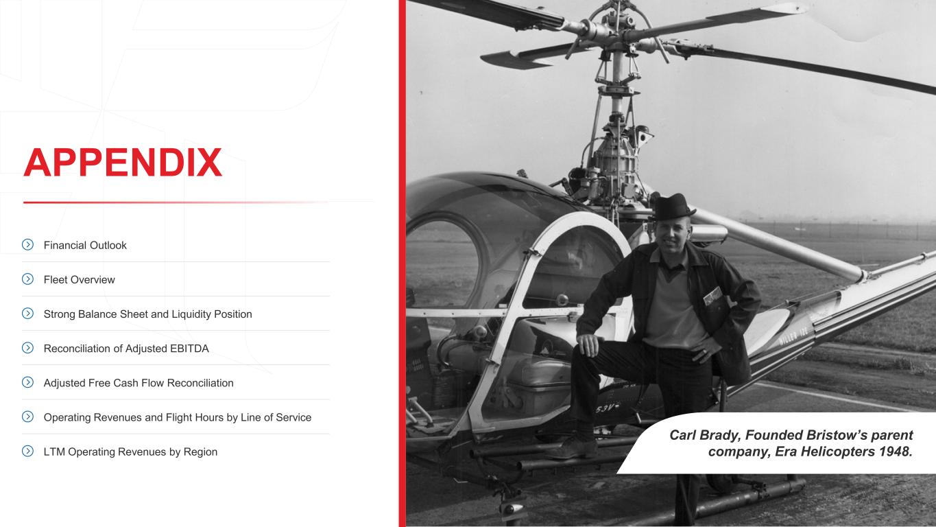 APPENDIX Carl Brady, Founded Bristow’s parent company, Era Helicopters 1948. Financial Outlook Fleet Overview Strong Balance Sheet and Liquidity Position Reconciliation of Adjusted EBITDA Adjusted Free Cash Flow Reconciliation Operating Revenues and Flight Hours by Line of Service LTM Operating Revenues by Region