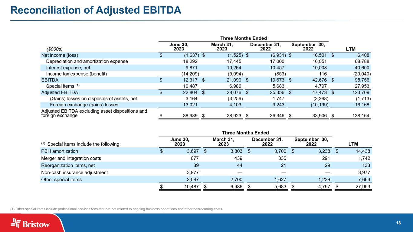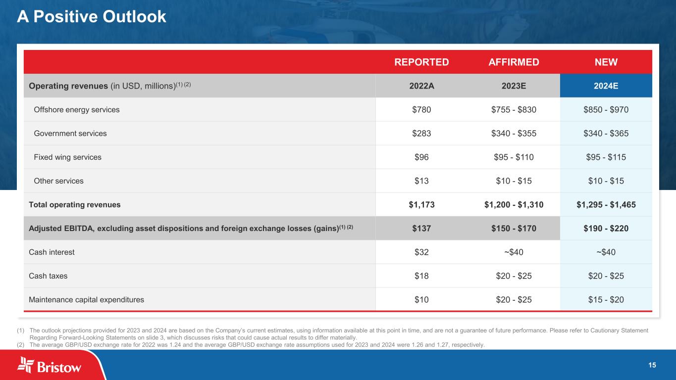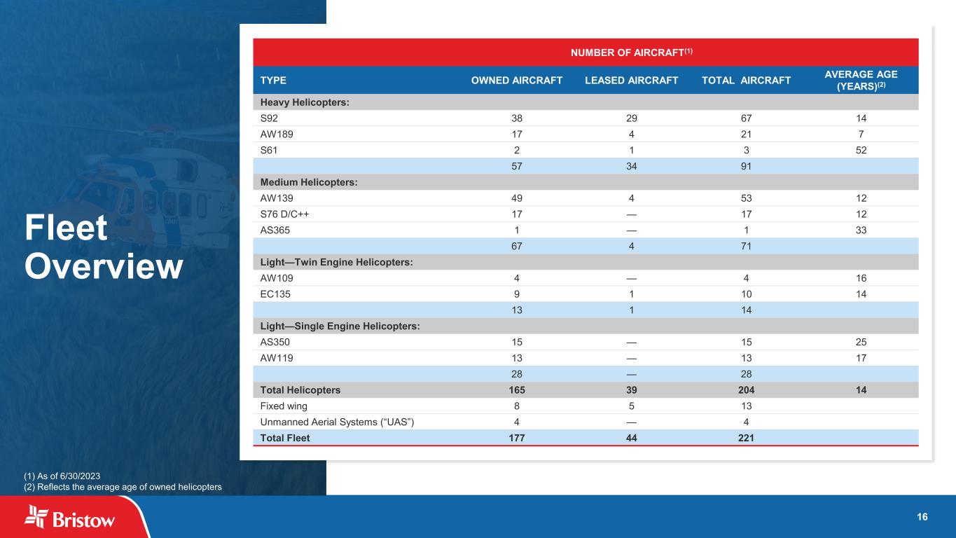 15 A Positive Outlook (1) The outlook projections provided for 2023 and 2024 are based on the Company’s current estimates, using information available at this point in time, and are not a guarantee of future performance. Please refer to Cautionary Statement Regarding Forward-Looking Statements on slide 3, which discusses risks that could cause actual results to differ materially. (2) The average GBP/USD exchange rate for 2022 was 1.24 and the average GBP/USD exchange rate assumptions used for 2023 and 2024 were 1.26 and 1.27, respectively. REPORTED AFFIRMED NEW Operating revenues (in USD, millions)(1) (2) 2022A 2023E 2024E Offshore energy services $780 $755 - $830 $850 - $970 Government services $283 $340 - $355 $340 - $365 Fixed wing services $96 $95 - $110 $95 - $115 Other services $13 $10 - $15 $10 - $15 Total operating revenues $1,173 $1,200 - $1,310 $1,295 - $1,465 Adjusted EBITDA, excluding asset dispositions and foreign exchange losses (gains)(1) (2) $137 $150 - $170 $190 - $220 Cash interest $32 ~$40 ~$40 Cash taxes $18 $20 - $25 $20 - $25 Maintenance capital expenditures $10 $20 - $25 $15 - $20