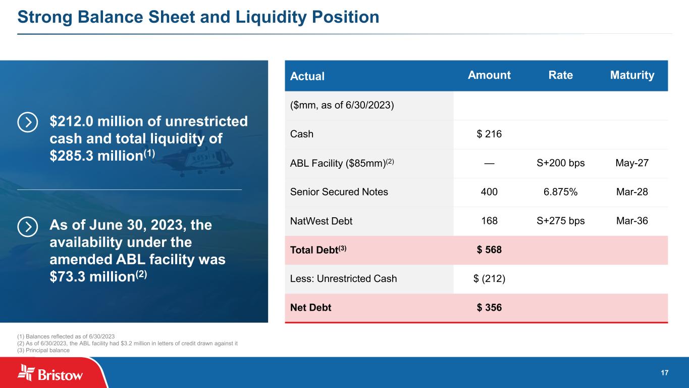 16 Fleet Overview NUMBER OF AIRCRAFT(1) TYPE OWNED AIRCRAFT LEASED AIRCRAFT TOTAL AIRCRAFT AVERAGE AGE (YEARS)(2) Heavy Helicopters: S92 38 29 67 14 AW189 17 4 21 7 S61 2 1 3 52 57 34 91 Medium Helicopters: AW139 49 4 53 12 S76 D/C++ 17 — 17 12 AS365 1 — 1 33 67 4 71 Light—Twin Engine Helicopters: AW109 4 — 4 16 EC135 9 1 10 14 13 1 14 Light—Single Engine Helicopters: AS350 15 — 15 25 AW119 13 — 13 17 28 — 28 Total Helicopters 165 39 204 14 Fixed wing 8 5 13 Unmanned Aerial Systems (“UAS”) 4 — 4 Total Fleet 177 44 221 (1) As of 6/30/2023 (2) Reflects the average age of owned helicopters