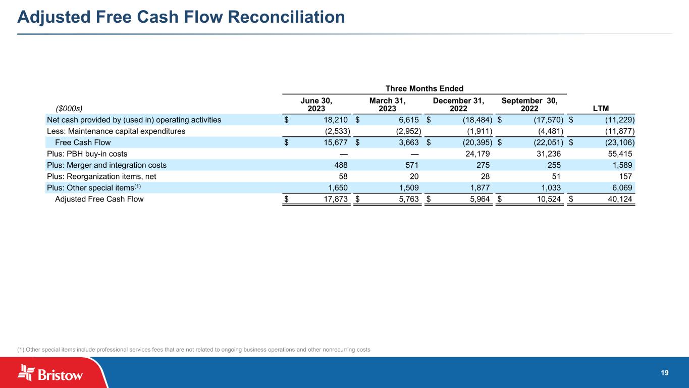 18 Reconciliation of Adjusted EBITDA (1) Other special items include professional services fees that are not related to ongoing business operations and other nonrecurring costs Three Months Ended (1) Special items include the following: June 30, 2023 March 31, 2023 December 31, 2022 September 30, 2022 LTM PBH amortization $ 3,697 $ 3,803 $ 3,700 $ 3,238 $ 14,438 Merger and integration costs 677 439 335 291 1,742 Reorganization items, net 39 44 21 29 133 Non-cash insurance adjustment 3,977 — — — 3,977 Other special items 2,097 2,700 1,627 1,239 7,663 $ 10,487 $ 6,986 $ 5,683 $ 4,797 $ 27,953