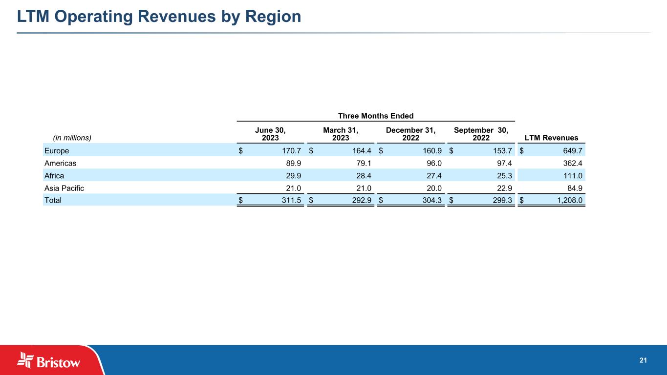 20 Operating Revenues and Flight Hours by Line of Service Three Months Ended June 30, 2023 March 31, 2023 December 31, 2022 September 30, 2022 LTM Operating revenues ($000s) Offshore energy services: Europe $ 87,331 $ 85,291 $ 87,321 $ 87,867 $ 347,810 Americas 80,884 70,982 87,164 88,015 327,045 Africa 26,979 25,356 24,120 21,194 97,649 Total offshore energy services 195,194 181,629 198,605 197,076 772,504 Government services 87,320 82,334 77,013 69,908 316,575 Fixed wing services 26,448 25,919 25,065 28,945 106,377 Other services 2,560 3,049 3,658 3,462 12,729 $ 311,522 $ 292,931 $ 304,341 $ 299,391 $ 1,208,185 Three Months Ended June 30, 2023 March 31, 2023 December 31, 2022 September 30, 2022 Flight hours by line of service Offshore energy services: Europe 10,532 10,298 10,658 10,373 Americas 8,676 8,129 9,218 10,361 Africa 3,241 2,905 3,292 2,914 Total offshore energy services 22,449 21,332 23,168 23,648 Government services 5,008 3,944 4,659 4,457 Fixed wing services 2,691 2,533 2,826 3,157 30,148 27,809 30,653 31,262