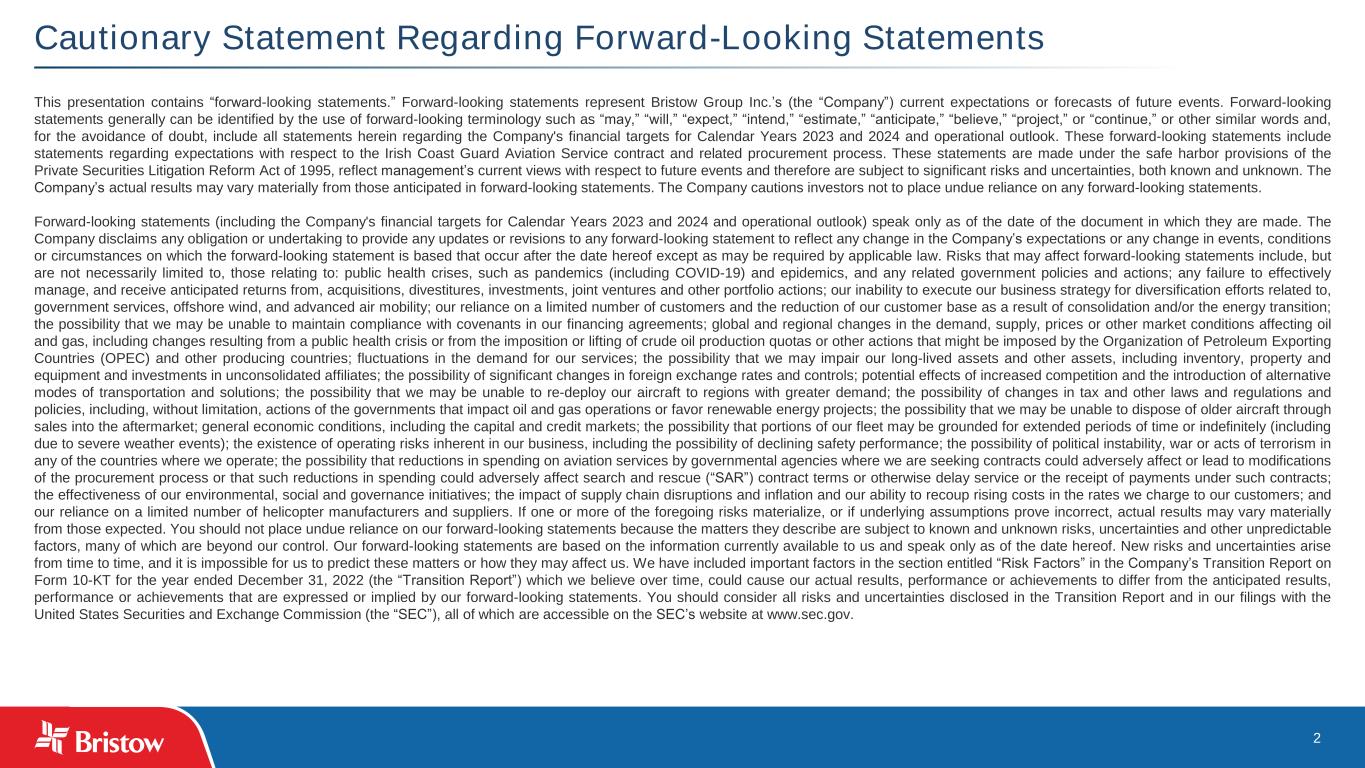 2 Cautionary Statement Regarding Forward-Looking Statements This presentation contains “forward-looking statements.” Forward-looking statements represent Bristow Group Inc.’s (the “Company”) current expectations or forecasts of future events. Forward-looking statements generally can be identified by the use of forward-looking terminology such as “may,” “will,” “expect,” “intend,” “estimate,” “anticipate,” “believe,” “project,” or “continue,” or other similar words and, for the avoidance of doubt, include all statements herein regarding the Company's financial targets for Calendar Years 2023 and 2024 and operational outlook. These forward-looking statements include statements regarding expectations with respect to the Irish Coast Guard Aviation Service contract and related procurement process. These statements are made under the safe harbor provisions of the Private Securities Litigation Reform Act of 1995, reflect management’s current views with respect to future events and therefore are subject to significant risks and uncertainties, both known and unknown. The Company’s actual results may vary materially from those anticipated in forward-looking statements. The Company cautions investors not to place undue reliance on any forward-looking statements. Forward-looking statements (including the Company's financial targets for Calendar Years 2023 and 2024 and operational outlook) speak only as of the date of the document in which they are made. The Company disclaims any obligation or undertaking to provide any updates or revisions to any forward-looking statement to reflect any change in the Company’s expectations or any change in events, conditions or circumstances on which the forward-looking statement is based that occur after the date hereof except as may be required by applicable law. Risks that may affect forward-looking statements include, but are not necessarily limited to, those relating to: public health crises, such as pandemics (including COVID-19) and epidemics, and any related government policies and actions; any failure to effectively manage, and receive anticipated returns from, acquisitions, divestitures, investments, joint ventures and other portfolio actions; our inability to execute our business strategy for diversification efforts related to, government services, offshore wind, and advanced air mobility; our reliance on a limited number of customers and the reduction of our customer base as a result of consolidation and/or the energy transition; the possibility that we may be unable to maintain compliance with covenants in our financing agreements; global and regional changes in the demand, supply, prices or other market conditions affecting oil and gas, including changes resulting from a public health crisis or from the imposition or lifting of crude oil production quotas or other actions that might be imposed by the Organization of Petroleum Exporting Countries (OPEC) and other producing countries; fluctuations in the demand for our services; the possibility that we may impair our long-lived assets and other assets, including inventory, property and equipment and investments in unconsolidated affiliates; the possibility of significant changes in foreign exchange rates and controls; potential effects of increased competition and the introduction of alternative modes of transportation and solutions; the possibility that we may be unable to re-deploy our aircraft to regions with greater demand; the possibility of changes in tax and other laws and regulations and policies, including, without limitation, actions of the governments that impact oil and gas operations or favor renewable energy projects; the possibility that we may be unable to dispose of older aircraft through sales into the aftermarket; general economic conditions, including the capital and credit markets; the possibility that portions of our fleet may be grounded for extended periods of time or indefinitely (including due to severe weather events); the existence of operating risks inherent in our business, including the possibility of declining safety performance; the possibility of political instability, war or acts of terrorism in any of the countries where we operate; the possibility that reductions in spending on aviation services by governmental agencies where we are seeking contracts could adversely affect or lead to modifications of the procurement process or that such reductions in spending could adversely affect search and rescue (“SAR”) contract terms or otherwise delay service or the receipt of payments under such contracts; the effectiveness of our environmental, social and governance initiatives; the impact of supply chain disruptions and inflation and our ability to recoup rising costs in the rates we charge to our customers; and our reliance on a limited number of helicopter manufacturers and suppliers. If one or more of the foregoing risks materialize, or if underlying assumptions prove incorrect, actual results may vary materially from those expected. You should not place undue reliance on our forward-looking statements because the matters they describe are subject to known and unknown risks, uncertainties and other unpredictable factors, many of which are beyond our control. Our forward-looking statements are based on the information currently available to us and speak only as of the date hereof. New risks and uncertainties arise from time to time, and it is impossible for us to predict these matters or how they may affect us. We have included important factors in the section entitled “Risk Factors” in the Company’s Transition Report on Form 10-KT for the year ended December 31, 2022 (the “Transition Report”) which we believe over time, could cause our actual results, performance or achievements to differ from the anticipated results, performance or achievements that are expressed or implied by our forward-looking statements