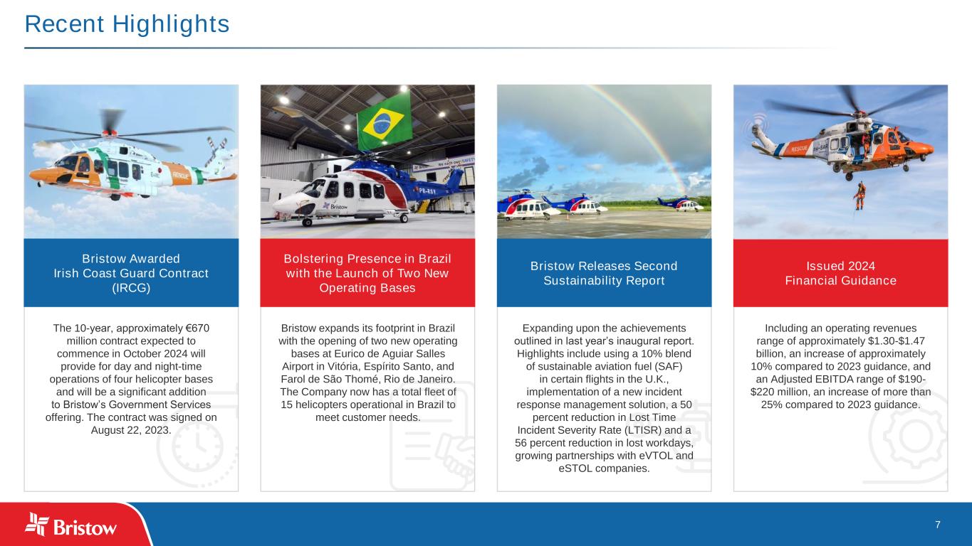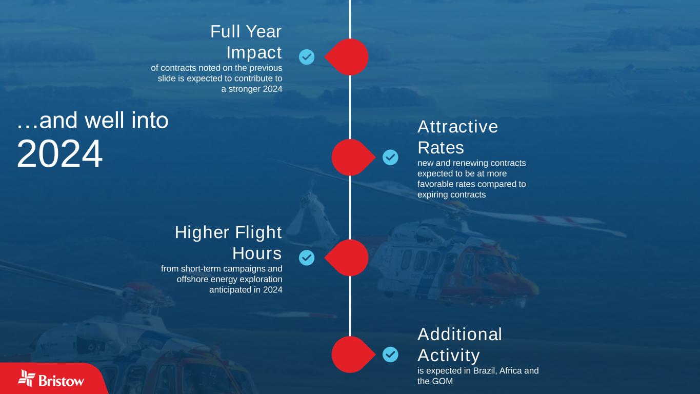Full Year Impact of contracts noted on the previous slide is expected to contribute to a stronger 2024 Attractive Rates new and renewing contracts expected to be at more favorable rates compared to expiring contracts Higher Flight Hours from short-term campaigns and offshore energy exploration anticipated in 2024 Additional Activity is expected in Brazil, Africa and the GOM …and well into 2024