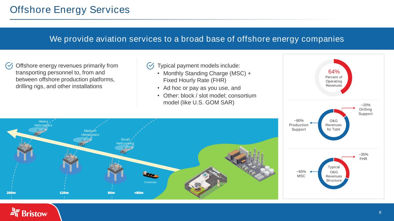 7 Recent Highlights The 10-year, approximately €670 million contract expected to commence in October 2024 will provide for day and night-time operations of four helicopter bases and will be a significant addition to Bristow’s Government Services offering. The contract was signed on August 22, 2023. Bristow expands its footprint in Brazil with the opening of two new operating bases at Eurico de Aguiar Salles Airport in Vitória, Espírito Santo, and Farol de São Thomé, Rio de Janeiro. The Company now has a total fleet of 15 helicopters operational in Brazil to meet customer needs. Expanding upon the achievements outlined in last year’s inaugural report. Highlights include using a 10% blend of sustainable aviation fuel (SAF) in certain flights in the U.K., implementation of a new incident response management solution, a 50 percent reduction in Lost Time Incident Severity Rate (LTISR) and a 56 percent reduction in lost workdays, growing partnerships with eVTOL and eSTOL companies. Including an operating revenues range of approximately $1.30-$1.47 billion, an increase of approximately 10% compared to 2023 guidance, and an Adjusted EBITDA range of $190- $220 million, an increase of more than 25% compared to 2023 guidance. Bristow Awarded Irish Coast Guard Contract (IRCG) Bolstering Presence in Brazil with the Launch of Two New Operating Bases Bristow Releases Second Sustainability Report Issued 2024 Financial Guidance
