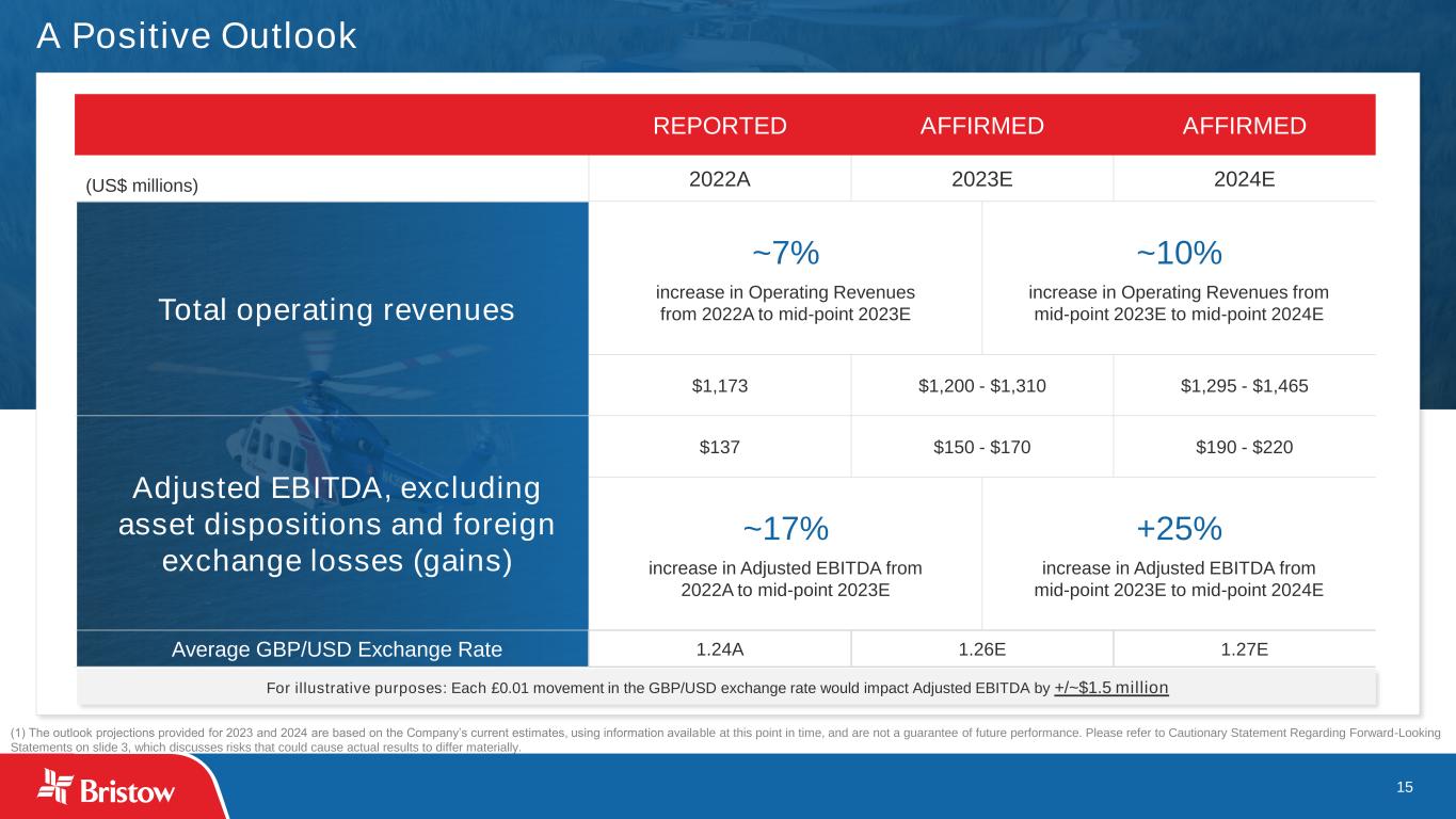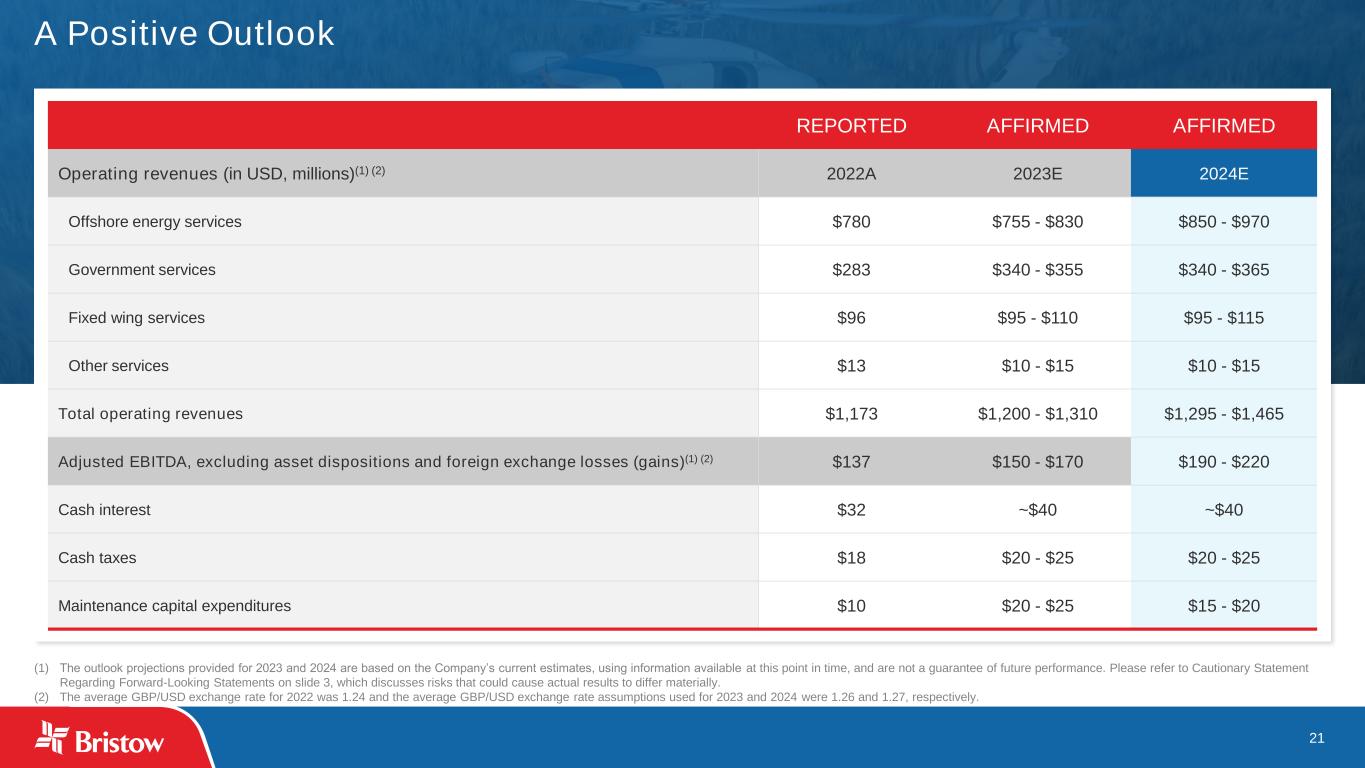 21 A Positive Outlook (1) The outlook projections provided for 2023 and 2024 are based on the Company’s current estimates, using information available at this point in time, and are not a guarantee of future performance. Please refer to Cautionary Statement Regarding Forward-Looking Statements on slide 3, which discusses risks that could cause actual results to differ materially. (2) The average GBP/USD exchange rate for 2022 was 1.24 and the average GBP/USD exchange rate assumptions used for 2023 and 2024 were 1.26 and 1.27, respectively. REPORTED AFFIRMED AFFIRMED Operating revenues (in USD, millions)(1) (2) 2022A 2023E 2024E Offshore energy services $780 $755 - $830 $850 - $970 Government services $283 $340 - $355 $340 - $365 Fixed wing services $96 $95 - $110 $95 - $115 Other services $13 $10 - $15 $10 - $15 Total operating revenues $1,173 $1,200 - $1,310 $1,295 - $1,465 Adjusted EBITDA, excluding asset dispositions and foreign exchange losses (gains)(1) (2) $137 $150 - $170 $190 - $220 Cash interest $32 ~$40 ~$40 Cash taxes $18 $20 - $25 $20 - $25 Maintenance capital expenditures $10 $20 - $25 $15 - $20