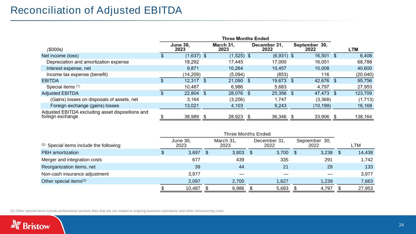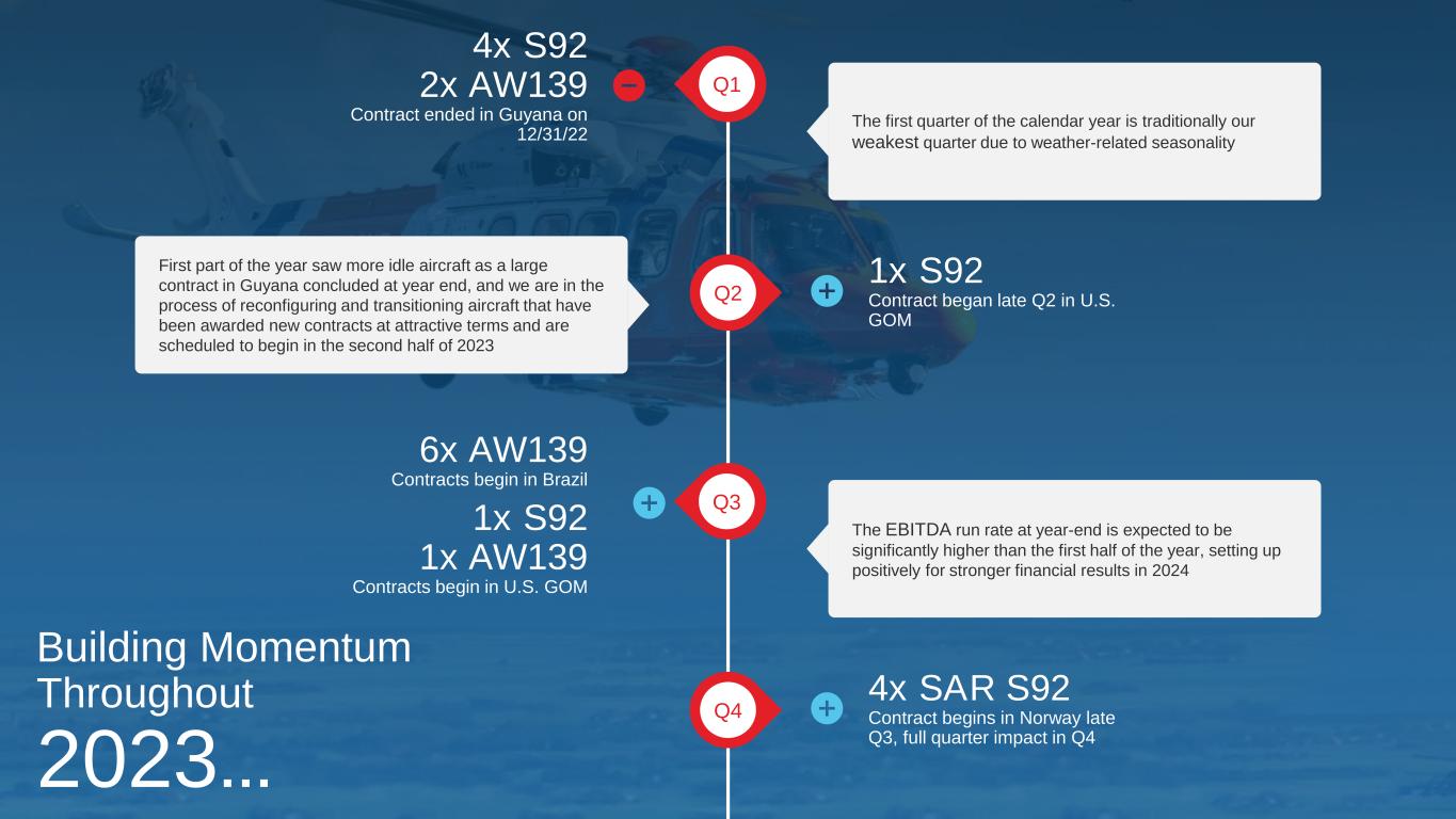 Q1 Q2 Q3 Q4 4x S92 2x AW139 Contract ended in Guyana on 12/31/22 1x S92 Contract began late Q2 in U.S. GOM 6x AW139 Contracts begin in Brazil 1x S92 1x AW139 Contracts begin in U.S. GOM 4x SAR S92 Contract begins in Norway late Q3, full quarter impact in Q4 The first quarter of the calendar year is traditionally our weakest quarter due to weather-related seasonality First part of the year saw more idle aircraft as a large contract in Guyana concluded at year end, and we are in the process of reconfiguring and transitioning aircraft that have been awarded new contracts at attractive terms and are scheduled to begin in the second half of 2023 The EBITDA run rate at year-end is expected to be significantly higher than the first half of the year, setting up positively for stronger financial results in 2024 Building Momentum Throughout 2023…