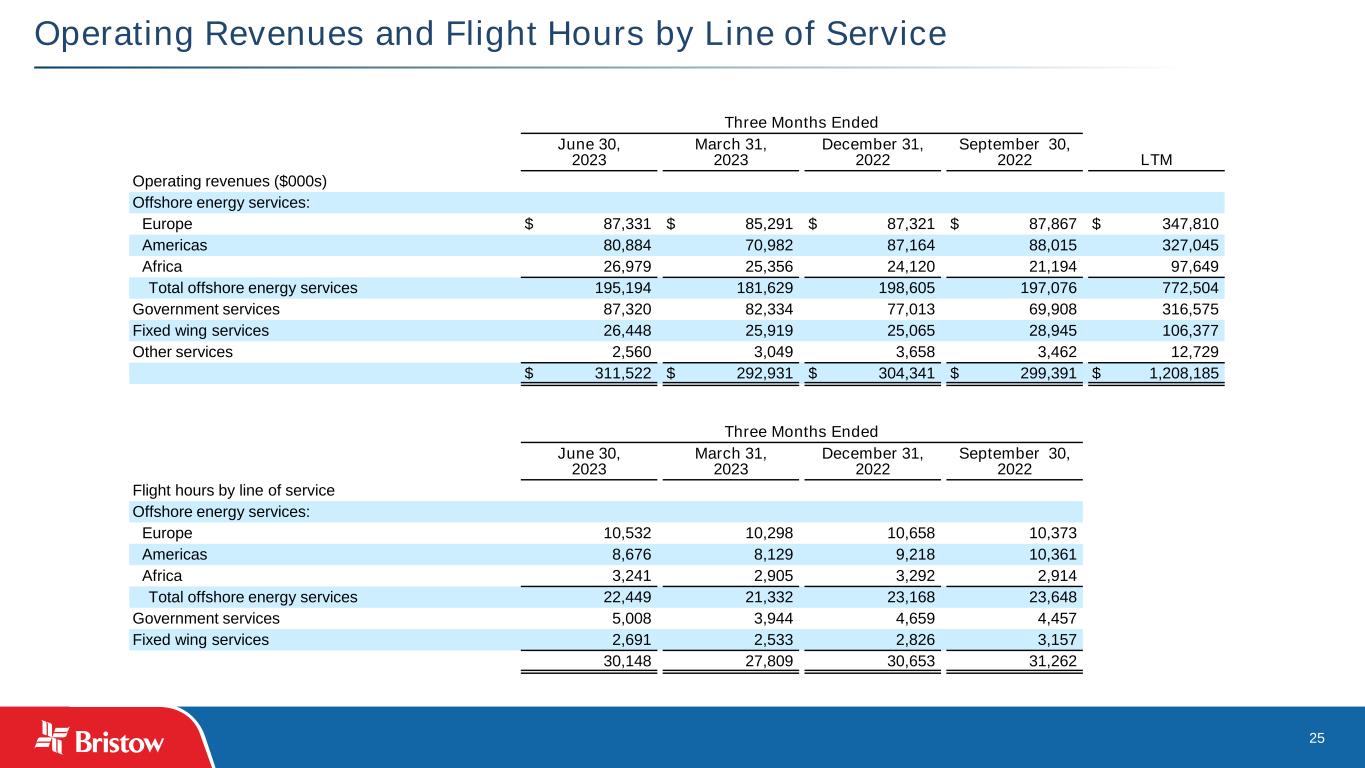 25 Operating Revenues and Flight Hours by Line of Service Three Months Ended June 30, 2023 March 31, 2023 December 31, 2022 September 30, 2022 LTM Operating revenues ($000s) Offshore energy services: Europe $ 87,331 $ 85,291 $ 87,321 $ 87,867 $ 347,810 Americas 80,884 70,982 87,164 88,015 327,045 Africa 26,979 25,356 24,120 21,194 97,649 Total offshore energy services 195,194 181,629 198,605 197,076 772,504 Government services 87,320 82,334 77,013 69,908 316,575 Fixed wing services 26,448 25,919 25,065 28,945 106,377 Other services 2,560 3,049 3,658 3,462 12,729 $ 311,522 $ 292,931 $ 304,341 $ 299,391 $ 1,208,185 Three Months Ended June 30, 2023 March 31, 2023 December 31, 2022 September 30, 2022 Flight hours by line of service Offshore energy services: Europe 10,532 10,298 10,658 10,373 Americas 8,676 8,129 9,218 10,361 Africa 3,241 2,905 3,292 2,914 Total offshore energy services 22,449 21,332 23,168 23,648 Government services 5,008 3,944 4,659 4,457 Fixed wing services 2,691 2,533 2,826 3,157 30,148 27,809 30,653 31,262