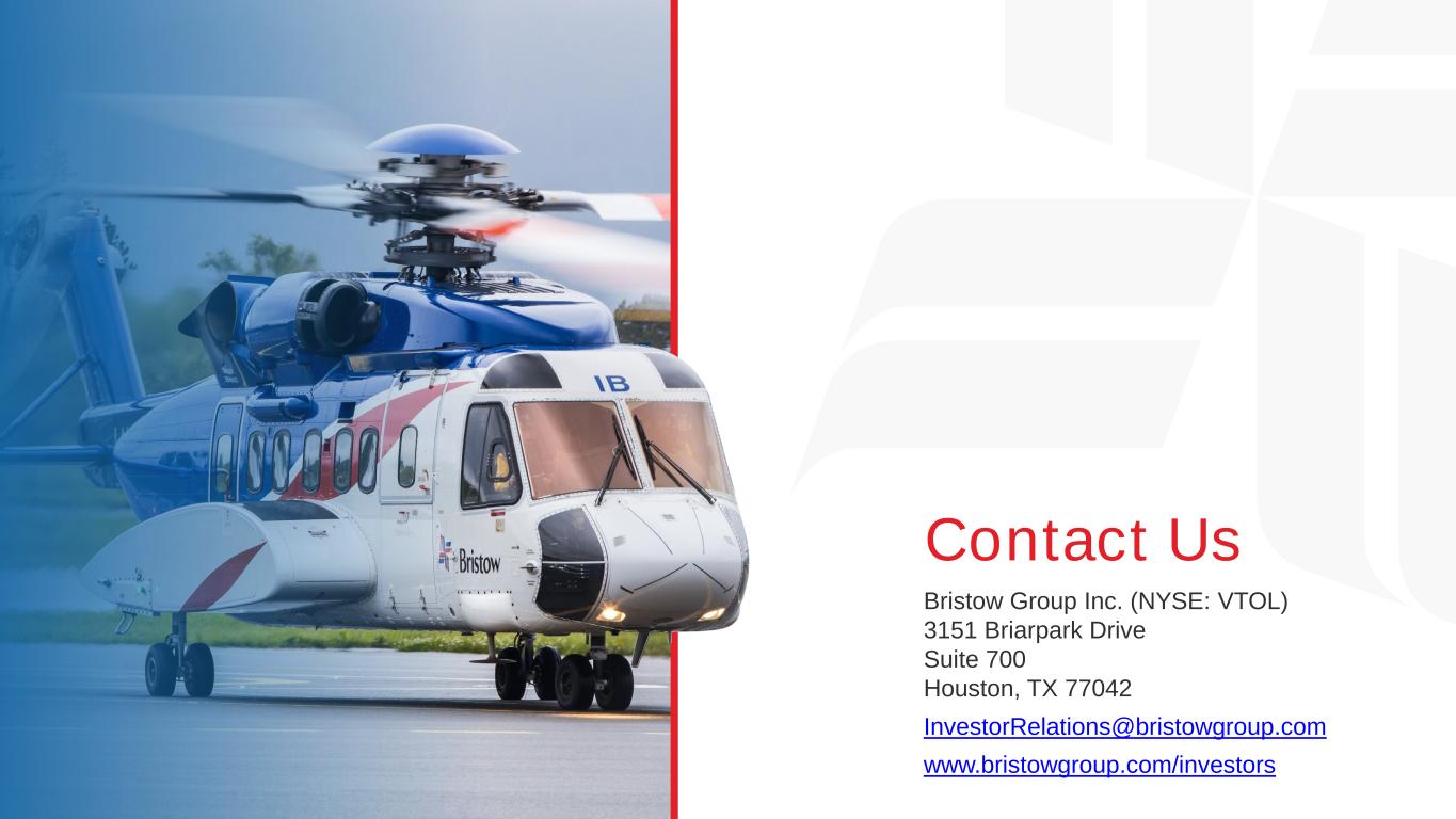 Contact Us Bristow Group Inc. (NYSE: VTOL) 3151 Briarpark Drive Suite 700 Houston, TX 77042 InvestorRelations@bristowgroup.com www.bristowgroup.com/investors