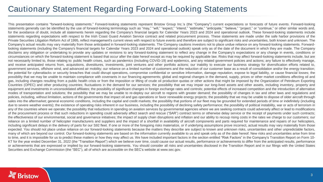 3 Cautionary Statement Regarding Forward-Looking Statements This presentation contains “forward-looking statements.” Forward-looking statements represent Bristow Group Inc.’s (the “Company”) current expectations or forecasts of future events. Forward-looking statements generally can be identified by the use of forward-looking terminology such as “may,” “will,” “expect,” “intend,” “estimate,” “anticipate,” “believe,” “project,” or “continue,” or other similar words and, for the avoidance of doubt, include all statements herein regarding the Company's financial targets for Calendar Years 2023 and 2024 and operational outlook. These forward-looking statements include statements regarding expectations with respect to the Irish Coast Guard Aviation Service contract and related procurement process. These statements are made under the safe harbor provisions of the Private Securities Litigation Reform Act of 1995, reflect management’s current views with respect to future events and therefore are subject to significant risks and uncertainties, both known and unknown. The Company’s actual results may vary materially from those anticipated in forward-looking statements. The Company cautions investors not to place undue reliance on any forward-looking statements. Forward- looking statements (including the Company's financial targets for Calendar Years 2023 and 2024 and operational outlook) speak only as of the date of the document in which they are made. The Company disclaims any obligation or undertaking to provide any updates or revisions to any forward-looking statement to reflect any change in the Company’s expectations or any change in events, conditions or circumstances on which the forward-looking statement is based that occur after the date hereof except as may be required by applicable law. Risks that may affect forward-looking statements include, but are not necessarily limited to, those relating to: public health crises, such as pandemics (including COVID-19) and epidemics, and any related government policies and actions; any failure to effectively manage, and receive anticipated returns from, acquisitions, divestitures, investments, joint ventures and other portfolio actions; our inability to execute our business strategy for diversification efforts related to, government services, offshore wind, and advanced air mobility; our reliance on a limited number of customers and the reduction of our customer base as a result of consolidation and/or the energy transition; the potential for cyberattacks or security breaches that could disrupt operations, compromise confidential or sensitive information, damage reputation, expose to legal liability, or cause financial losses; the possibility that we may be unable to maintain compliance with covenants in our financing agreements; global and regional changes in the demand, supply, prices or other market conditions affecting oil and gas, including changes resulting from a public health crisis or from the imposition or lifting of crude oil production quotas or other actions that might be imposed by the Organization of Petroleum Exporting Countries (OPEC) and other producing countries; fluctuations in the demand for our services; the possibility that we may impair our long-lived assets and other assets, including inventory, property and equipment and investments in unconsolidated affiliates; the possibility of significant changes in foreign exchange rates and controls; potential effects of increased competition and the introduction of alternative modes of transportation and solutions; the possibility that we may be unable to re-deploy our aircraft to regions with greater demand; the possibility of changes in tax and other laws and regulations and policies, including, without limitation, actions of the governments that impact oil and gas operations or favor renewable energy projects; the possibility that we may be unable to dispose of older aircraft through sales into the aftermarket; general economic conditions, including the capital and credit markets; the possibility that portions of our fleet may be grounded for extended periods of time or indefinitely (including due to severe weather events); the existence of operating risks inherent in our business, including the possibility of declining safety performance; the possibility of political instability, war or acts of terrorism in any of the countries where we operate; the possibility that reductions in spending on aviation services by governmental agencies where we are seeking contracts could adversely affect or lead to modifications of the procurement process or that such reductions in spending could adversely affect search and rescue (“SAR”) contract terms or otherwise delay service or the receipt of payments under such contracts; the effectiveness of our environmental, social and governance initiatives; the impact of supply chain disruptions and inflation and our ability to recoup rising costs in the rates we charge to our customers; our reliance on a limited number of helicopter manufacturers and suppliers and the impact of a shortfall in availability of aircraft components and parts required for maintenance and repairs of our helicopters, including significant delays in the delivery of parts for our S92 fleet. If one or more of the foregoing risks materialize, or if underlying assumptions prove incorrect, actual results may vary materially from those expected. You should not place undue reliance on our forward-looking statements because the matters they describe are subject to known and unknown risks, uncertainties and other unpredictable factors, many of which are beyond our control. Our forward-looking statements are based on the information currently available to us and speak only as of the date hereof. New risks and uncertainties arise from time to time, and it is impossible for us to predict these matters or how they may affect us. We h