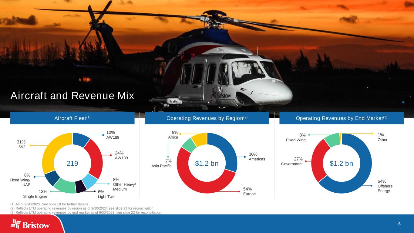 5 Leading Global Provider of Innovative and Sustainable Vertical Flight Solutions Global Employees 3,314 Total 849 Pilots 869 Mechanics Headquartered in Houston, TX Lines of Services: 4 Offshore Energy Services Government Services Fixed Wing Services Other Services Publicly Traded on NYSE (VTOL) Presence on 6 Continents Customers in 17 Countries Diverse fleet of 219 Aircraft LTM operating revenues of $1.2 billion Aircraft Type Rotary Wing Fixed Wing UAS As of 9/30/2023