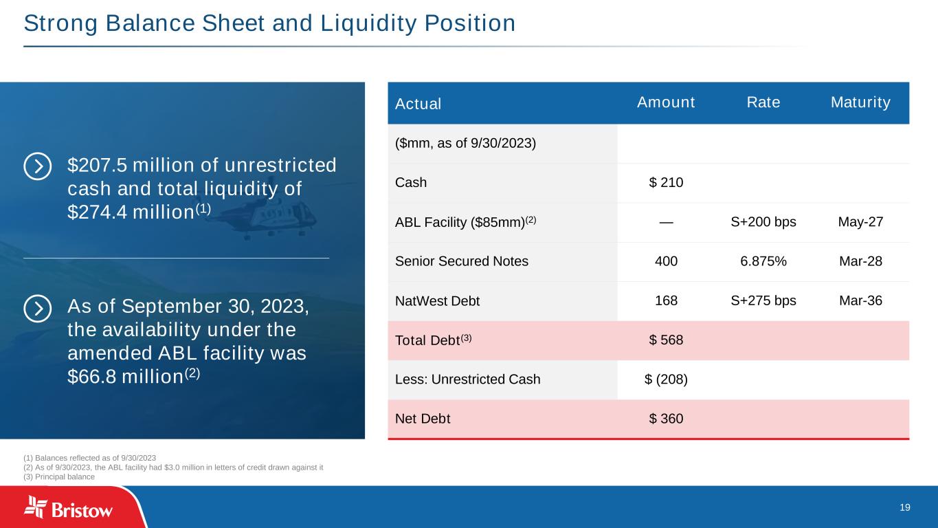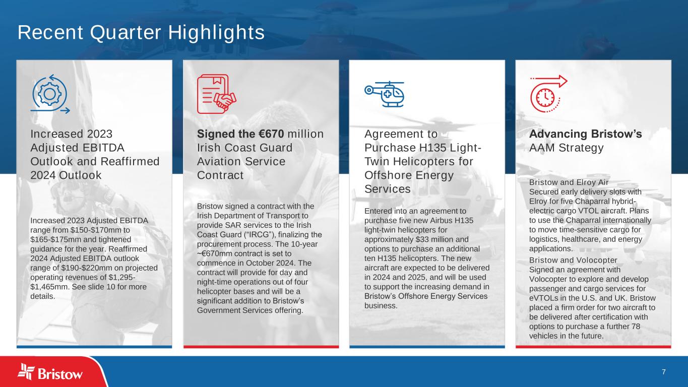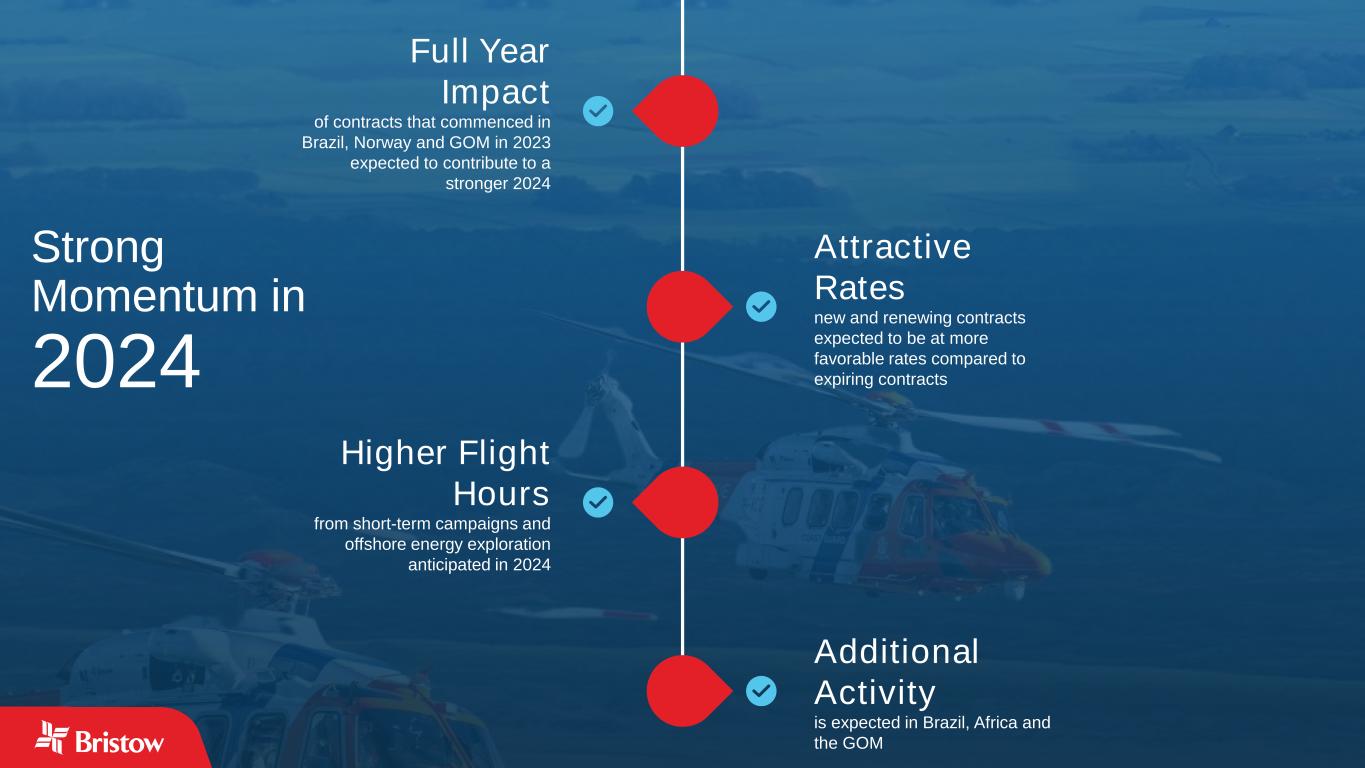 Full Year Impact of contracts that commenced in Brazil, Norway and GOM in 2023 expected to contribute to a stronger 2024 Attractive Rates new and renewing contracts expected to be at more favorable rates compared to expiring contracts Higher Flight Hours from short-term campaigns and offshore energy exploration anticipated in 2024 Additional Activity is expected in Brazil, Africa and the GOM Strong Momentum in 2024
