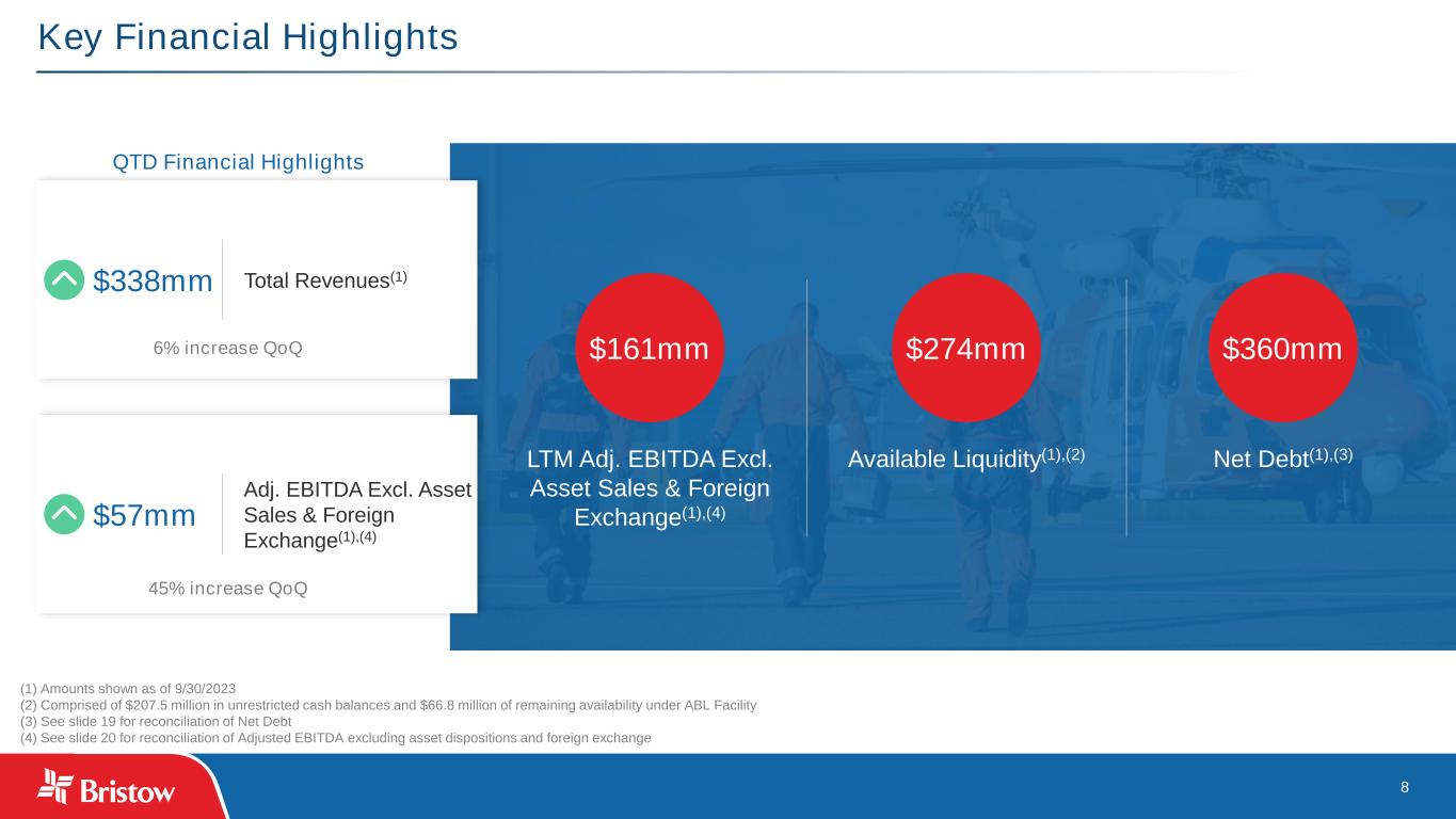 7 Recent Quarter Highlights Increased 2023 Adjusted EBITDA range from $150-$170mm to $165-$175mm and tightened guidance for the year. Reaffirmed 2024 Adjusted EBITDA outlook range of $190-$220mm on projected operating revenues of $1,295- $1,465mm. See slide 10 for more details. Increased 2023 Adjusted EBITDA Outlook and Reaffirmed 2024 Outlook Agreement to Purchase H135 Light- Twin Helicopters for Offshore Energy Services Advancing Bristow’s AAM Strategy Bristow and Elroy Air Secured early delivery slots with Elroy for five Chaparral hybrid- electric cargo VTOL aircraft. Plans to use the Chaparral internationally to move time-sensitive cargo for logistics, healthcare, and energy applications. Bristow and Volocopter Signed an agreement with Volocopter to explore and develop passenger and cargo services for eVTOLs in the U.S. and UK. Bristow placed a firm order for two aircraft to be delivered after certification with options to purchase a further 78 vehicles in the future. Bristow signed a contract with the Irish Department of Transport to provide SAR services to the Irish Coast Guard (“IRCG”), finalizing the procurement process. The 10-year ~€670mm contract is set to commence in October 2024. The contract will provide for day and night-time operations out of four helicopter bases and will be a significant addition to Bristow’s Government Services offering. Signed the €670 million Irish Coast Guard Aviation Service Contract Entered into an agreement to purchase five new Airbus H135 light-twin helicopters for approximately $33 million and options to purchase an additional ten H135 helicopters. The new aircraft are expected to be delivered in 2024 and 2025, and will be used to support the increasing demand in Bristow’s Offshore Energy Services business.