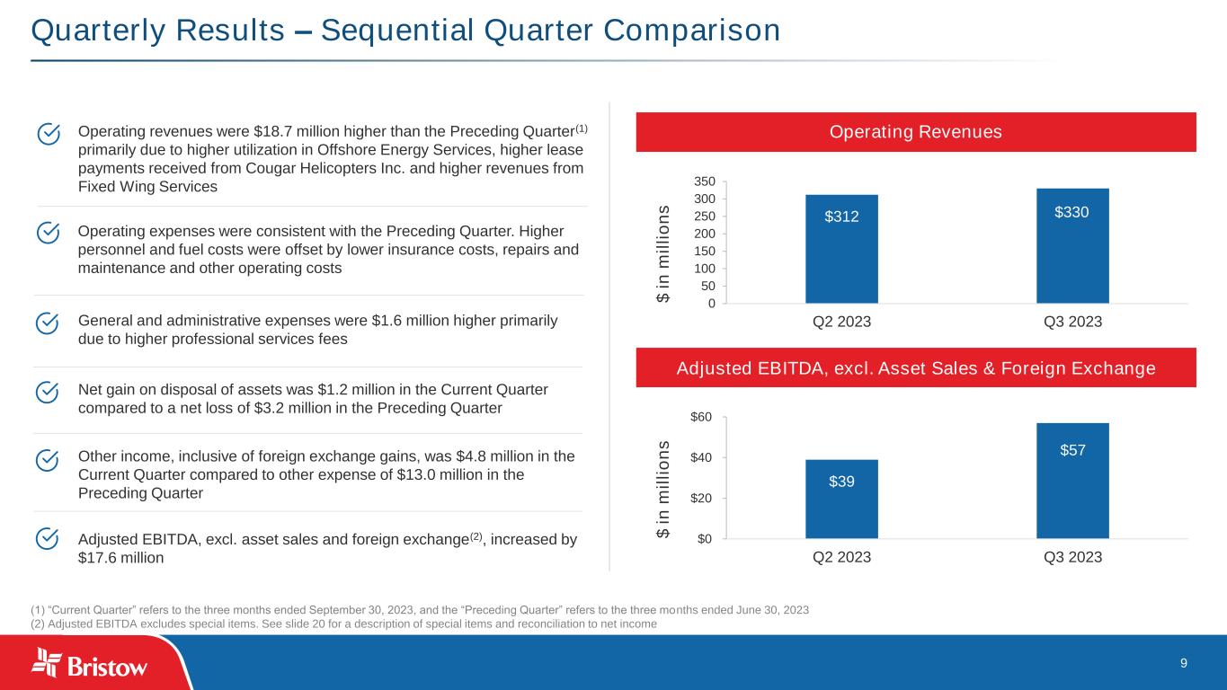 9 Quarterly Results – Sequential Quarter Comparison Operating revenues were $18.7 million higher than the Preceding Quarter(1) primarily due to higher utilization in Offshore Energy Services, higher lease payments received from Cougar Helicopters Inc. and higher revenues from Fixed Wing Services Operating expenses were consistent with the Preceding Quarter. Higher personnel and fuel costs were offset by lower insurance costs, repairs and maintenance and other operating costs General and administrative expenses were $1.6 million higher primarily due to higher professional services fees Net gain on disposal of assets was $1.2 million in the Current Quarter compared to a net loss of $3.2 million in the Preceding Quarter Other income, inclusive of foreign exchange gains, was $4.8 million in the Current Quarter compared to other expense of $13.0 million in the Preceding Quarter (1) “Current Quarter” refers to the three months ended September 30, 2023, and the “Preceding Quarter” refers to the three months ended June 30, 2023 (2) Adjusted EBITDA excludes special items. See slide 20 for a description of special items and reconciliation to net income $312 $330 0 50 100 150 200 250 300 350 Q2 2023 Q3 2023 $ i n m il li o n s Operating Revenues Adjusted EBITDA, excl. Asset Sales & Foreign Exchange $39 $57 $0 $20 $40 $60 Q2 2023 Q3 2023 $ i n m il li o n s Adjusted EBITDA, excl. asset sales and foreign exchange(2), increased by $17.6 million
