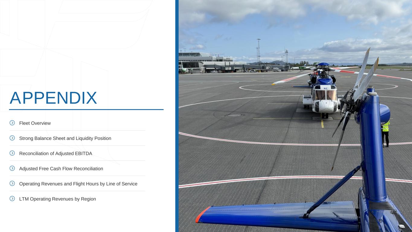 APPENDIX Fleet Overview Strong Balance Sheet and Liquidity Position Reconciliation of Adjusted EBITDA Adjusted Free Cash Flow Reconciliation Operating Revenues and Flight Hours by Line of Service LTM Operating Revenues by Region