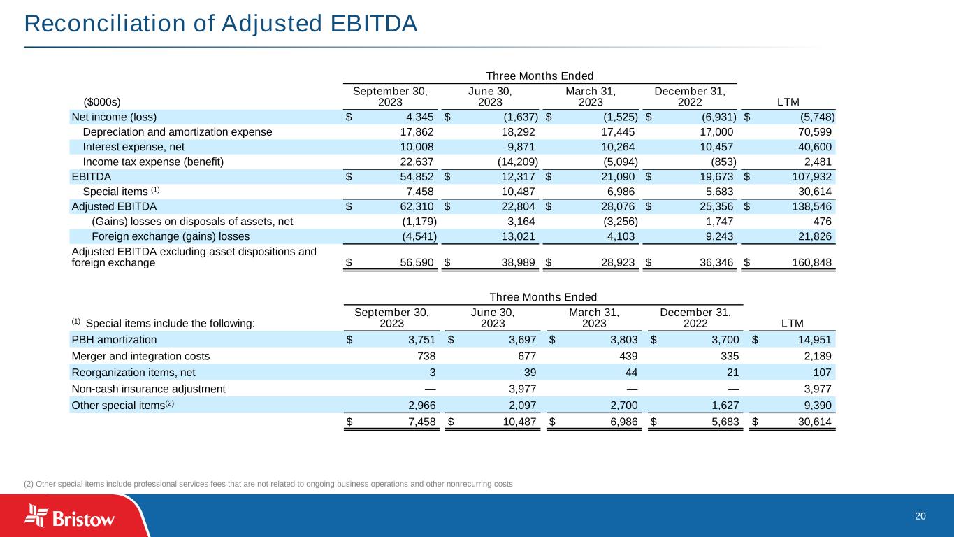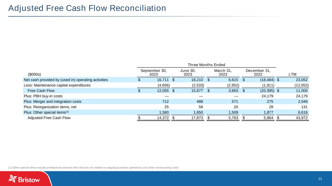20 Reconciliation of Adjusted EBITDA (2) Other special items include professional services fees that are not related to ongoing business operations and other nonrecurring costs Three Months Ended ($000s) September 30, 2023 June 30, 2023 March 31, 2023 December 31, 2022 LTM Net income (loss) $ 4,345 $ (1,637) $ (1,525) $ (6,931) $ (5,748) Depreciation and amortization expense 17,862 18,292 17,445 17,000 70,599 Interest expense, net 10,008 9,871 10,264 10,457 40,600 Income tax expense (benefit) 22,637 (14,209) (5,094) (853) 2,481 EBITDA $ 54,852 $ 12,317 $ 21,090 $ 19,673 $ 107,932 Special items (1) 7,458 10,487 6,986 5,683 30,614 Adjusted EBITDA $ 62,310 $ 22,804 $ 28,076 $ 25,356 $ 138,546 (Gains) losses on disposals of assets, net (1,179) 3,164 (3,256) 1,747 476 Foreign exchange (gains) losses (4,541) 13,021 4,103 9,243 21,826 Adjusted EBITDA excluding asset dispositions and foreign exchange $ 56,590 $ 38,989 $ 28,923 $ 36,346 $ 160,848 Three Months Ended (1) Special items include the following: September 30, 2023 June 30, 2023 March 31, 2023 December 31, 2022 LTM PBH amortization $ 3,751 $ 3,697 $ 3,803 $ 3,700 $ 14,951 Merger and integration costs 738 677 439 335 2,189 Reorganization items, net 3 39 44 21 107 Non-cash insurance adjustment — 3,977 — — 3,977 Other special items(2) 2,966 2,097 2,700 1,627 9,390 $ 7,458 $ 10,487 $ 6,986 $ 5,683 $ 30,614
