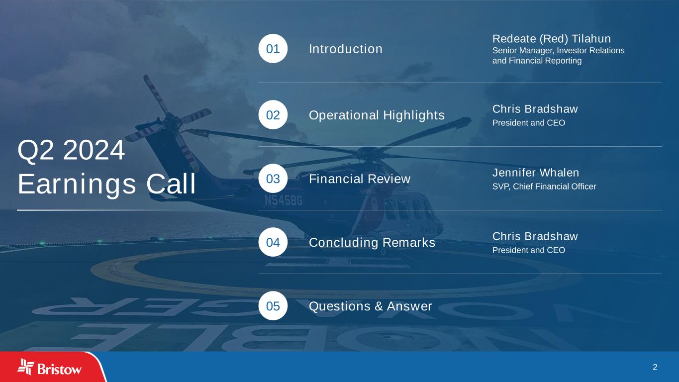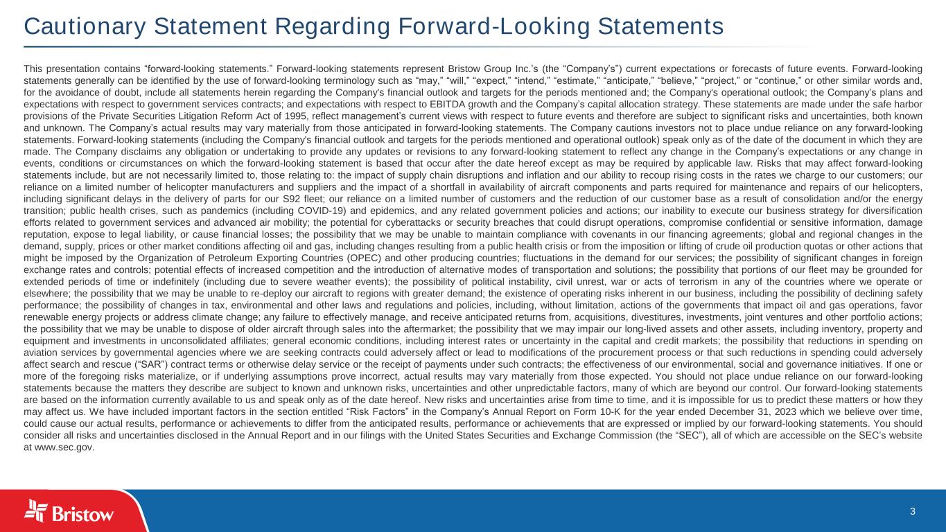 3 Cautionary Statement Regarding Forward-Looking Statements This presentation contains “forward-looking statements.” Forward-looking statements represent Bristow Group Inc.’s (the “Company’s”) current expectations or forecasts of future events. Forward-looking statements generally can be identified by the use of forward-looking terminology such as “may,” “will,” “expect,” “intend,” “estimate,” “anticipate,” “believe,” “project,” or “continue,” or other similar words and, for the avoidance of doubt, include all statements herein regarding the Company's financial outlook and targets for the periods mentioned and; the Company's operational outlook; the Company’s plans and expectations with respect to government services contracts; and expectations with respect to EBITDA growth and the Company’s capital allocation strategy. These statements are made under the safe harbor provisions of the Private Securities Litigation Reform Act of 1995, reflect management’s current views with respect to future events and therefore are subject to significant risks and uncertainties, both known and unknown. The Company’s actual results may vary materially from those anticipated in forward-looking statements. The Company cautions investors not to place undue reliance on any forward-looking statements. Forward-looking statements (including the Company's financial outlook and targets for the periods mentioned and operational outlook) speak only as of the date of the document in which they are made. The Company disclaims any obligation or undertaking to provide any updates or revisions to any forward-looking statement to reflect any change in the Company’s expectations or any change in events, conditions or circumstances on which the forward-looking statement is based that occur after the date hereof except as may be required by applicable law. Risks that may affect forward-looking statements include, but are not necessarily limited to, those relating to: the impact of supply chain disruptions and inflation and our ability to recoup rising costs in the rates we charge to our customers; our reliance on a limited number of helicopter manufacturers and suppliers and the impact of a shortfall in availability of aircraft components and parts required for maintenance and repairs of our helicopters, including significant delays in the delivery of parts for our S92 fleet; our reliance on a limited number of customers and the reduction of our customer base as a result of consolidation and/or the energy transition; public health crises, such as pandemics (including COVID-19) and epidemics, and any related government policies and actions; our inability to execute our business strategy for diversification efforts related to government services and advanced air mobility; the potential for cyberattacks or security breaches that could disrupt operations, compromise confidential or sensitive information, damage reputation, expose to legal liability, or cause financial losses; the possibility that we may be unable to maintain compliance with covenants in our financing agreements; global and regional changes in the demand, supply, prices or other market conditions affecting oil and gas, including changes resulting from a public health crisis or from the imposition or lifting of crude oil production quotas or other actions that might be imposed by the Organization of Petroleum Exporting Countries (OPEC) and other producing countries; fluctuations in the demand for our services; the possibility of significant changes in foreign exchange rates and controls; potential effects of increased competition and the introduction of alternative modes of transportation and solutions; the possibility that portions of our fleet may be grounded for extended periods of time or indefinitely (including due to severe weather events); the possibility of political instability, civil unrest, war or acts of terrorism in any of the countries where we operate or elsewhere; the possibility that we may be unable to re-deploy our aircraft to regions with greater demand; the existence of operating risks inherent in our business, including the possibility of declining safety performance; the possibility of changes in tax, environmental and other laws and regulations and policies, including, without limitation, actions of the governments that impact oil and gas operations, favor renewable energy projects or address climate change; any failure to effectively manage, and receive anticipated returns from, acquisitions, divestitures, investments, joint ventures and other portfolio actions; the possibility that we may be unable to dispose of older aircraft through sales into the aftermarket; the possibility that we may impair our long-lived assets and other assets, including inventory, property and equipment and investments in unconsolidated affiliates; general economic conditions, including interest rates or uncertainty in the capital and credit markets; the possibility that reductions in spending on aviation services by governmental agencies where we are seeking contracts could adversely affect or lead to modifications of the procurement process or that such reductions in spending could adversely affect search and rescue (“SAR”) contract terms or otherwise delay service or the receipt of payments under such contracts; the effectiveness of our environmental, social and governance initiatives. If one or more of the foregoing risks materialize, or if underlying assumptions prove incorrect, actual results may vary materially from those expected. You should not place undue reliance on our forward-looking statements because the matters they describe are subject to known and unknown risks, uncertainties and other unpredictable factors, many of which are beyond our control. Our forward-looking statements are based on the information currently available to us and speak only as of the date hereof. New risks and unc