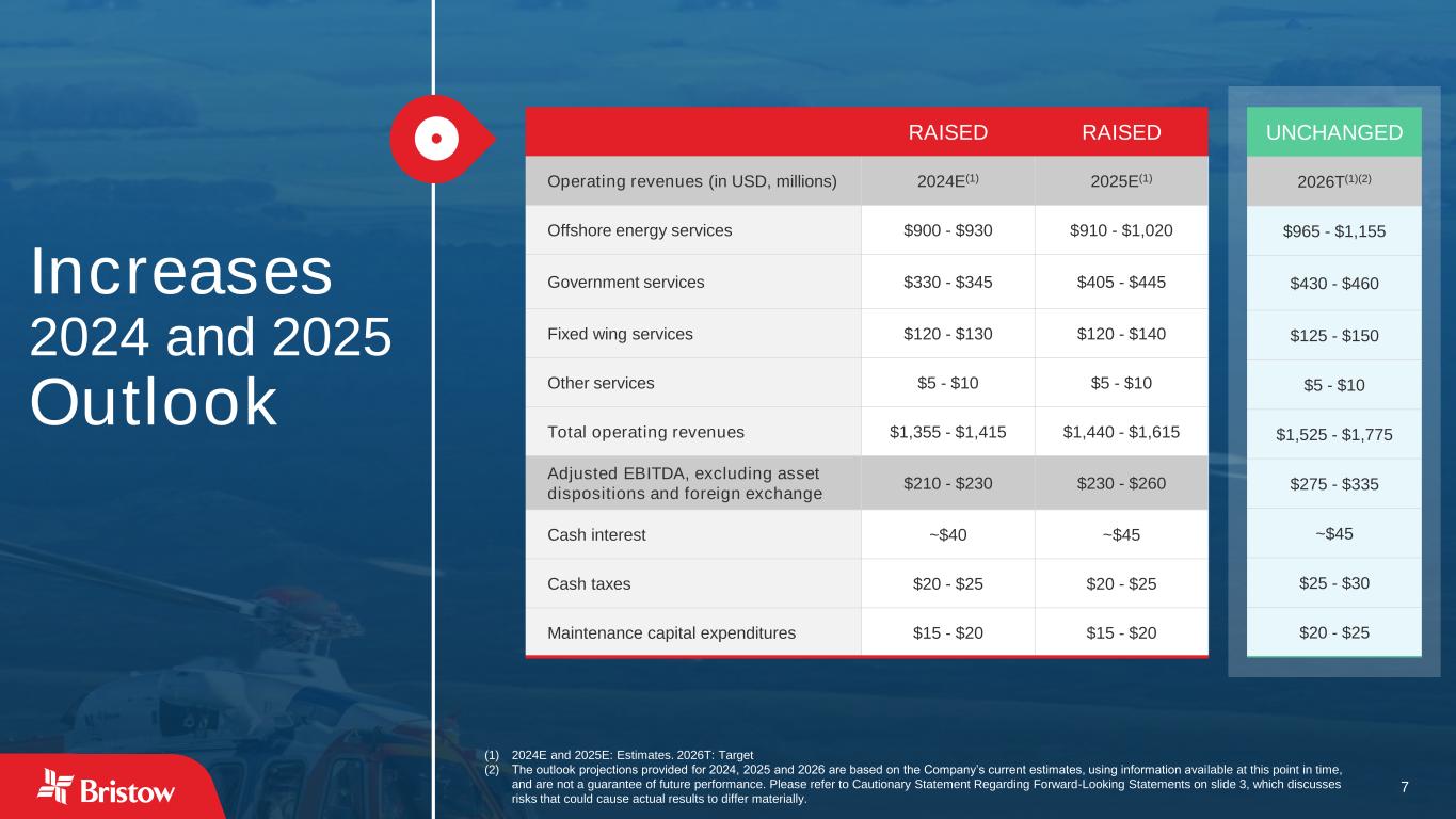 6 Q2 2024 Results – Sequential Quarter Comparison Operating revenues were $23.1 million higher than the Preceding Quarter(1) primarily due to higher utilization and increased rates in offshore energy services (“OES”) and fixed wing services, partially offset by lower revenues in government services General and administrative expenses were $1.6 million higher than the Preceding Quarter primarily due to higher professional services fees, partially offset by lower personnel and insurance costs (1) “Current Quarter” refers to the three months ended June 30, 2024, and the “Preceding Quarter” refers to the three months ended March 31, 2024 (2) Adjusted EBITDA excludes special items. See slide 15 for a description of special items and reconciliation to net income $329 $352 0 100 200 300 400 Q1 2024 Q2 2024 $ i n m il li o n s Operating Revenues Adjusted EBITDA, excl. Asset Sales & Foreign Exchange $47 $71 $0 $20 $40 $60 $80 Q1 2024 Q2 2024 $ i n m il li o n s Adjusted EBITDA, excl. asset sales and foreign exchange(2), increased by $23.8 million (+50% sequential growth) Operating expenses were $0.9 million lower in the Current Quarter primarily due to lower operating personnel salaries and leased-in equipment costs, partially offset by higher repairs and maintenance and other operating costs related to increased activity +50%