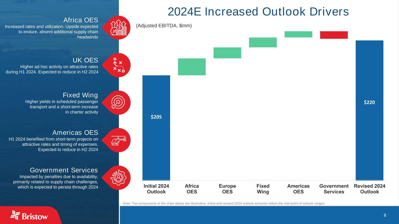 7 Increases 2024 and 2025 Outlook (1) 2024E and 2025E: Estimates. 2026T: Target (2) The outlook projections provided for 2024, 2025 and 2026 are based on the Company’s current estimates, using information available at this point in time, and are not a guarantee of future performance. Please refer to Cautionary Statement Regarding Forward-Looking Statements on slide 3, which discusses risks that could cause actual results to differ materially. RAISED RAISED Operating revenues (in USD, millions) 2024E(1) 2025E(1) Offshore energy services $900 - $930 $910 - $1,020 Government services $330 - $345 $405 - $445 Fixed wing services $120 - $130 $120 - $140 Other services $5 - $10 $5 - $10 Total operating revenues $1,355 - $1,415 $1,440 - $1,615 Adjusted EBITDA, excluding asset dispositions and foreign exchange $210 - $230 $230 - $260 Cash interest ~$40 ~$45 Cash taxes $20 - $25 $20 - $25 Maintenance capital expenditures $15 - $20 $15 - $20 UNCHANGED 2026T(1)(2) $965 - $1,155 $430 - $460 $125 - $150 $5 - $10 $1,525 - $1,775 $275 - $335 ~$45 $25 - $30 $20 - $25