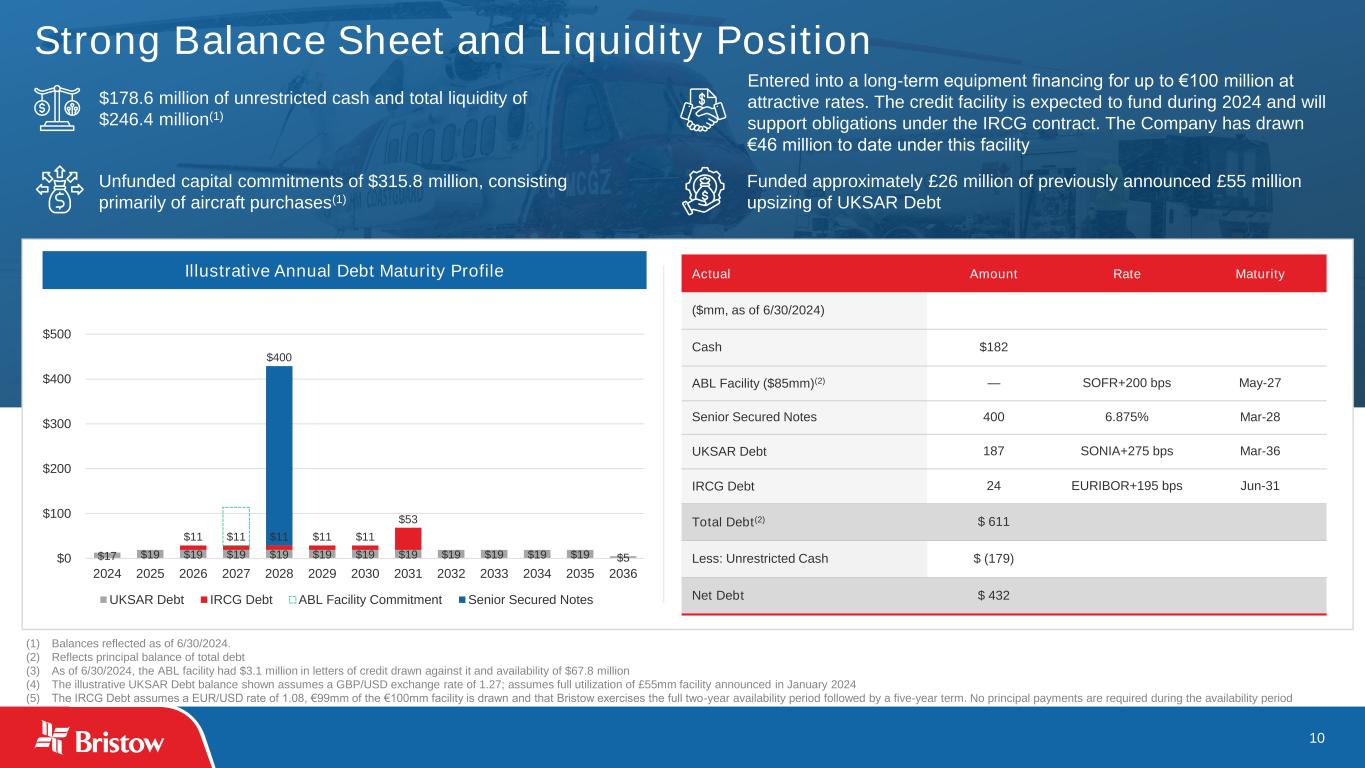 9 Full Year Impacts of new contracts commenced in prior year Attractive Leading-Edge Rates New and renewing contracts expected to be at more favorable rates compared to expiring contracts and continuing to reset well into 2026 Investment in Fleet Added capacity from new aircraft deliveries will be deployed on contracts with attractive terms and better pricing Additional Activity/Utilization Accelerating offshore energy growth is expected across the markets we operate in Investments and Accelerating Upcycle Driving Long-Term Growth 2023A Run Rate Impacts Government Services OES Utilization OES Rates 2026T Note: The components in the chart above are illustrative. Target amount for 2026T represents the mid-point of the range. $171 $305 (Adjusted EBITDA, $mm)