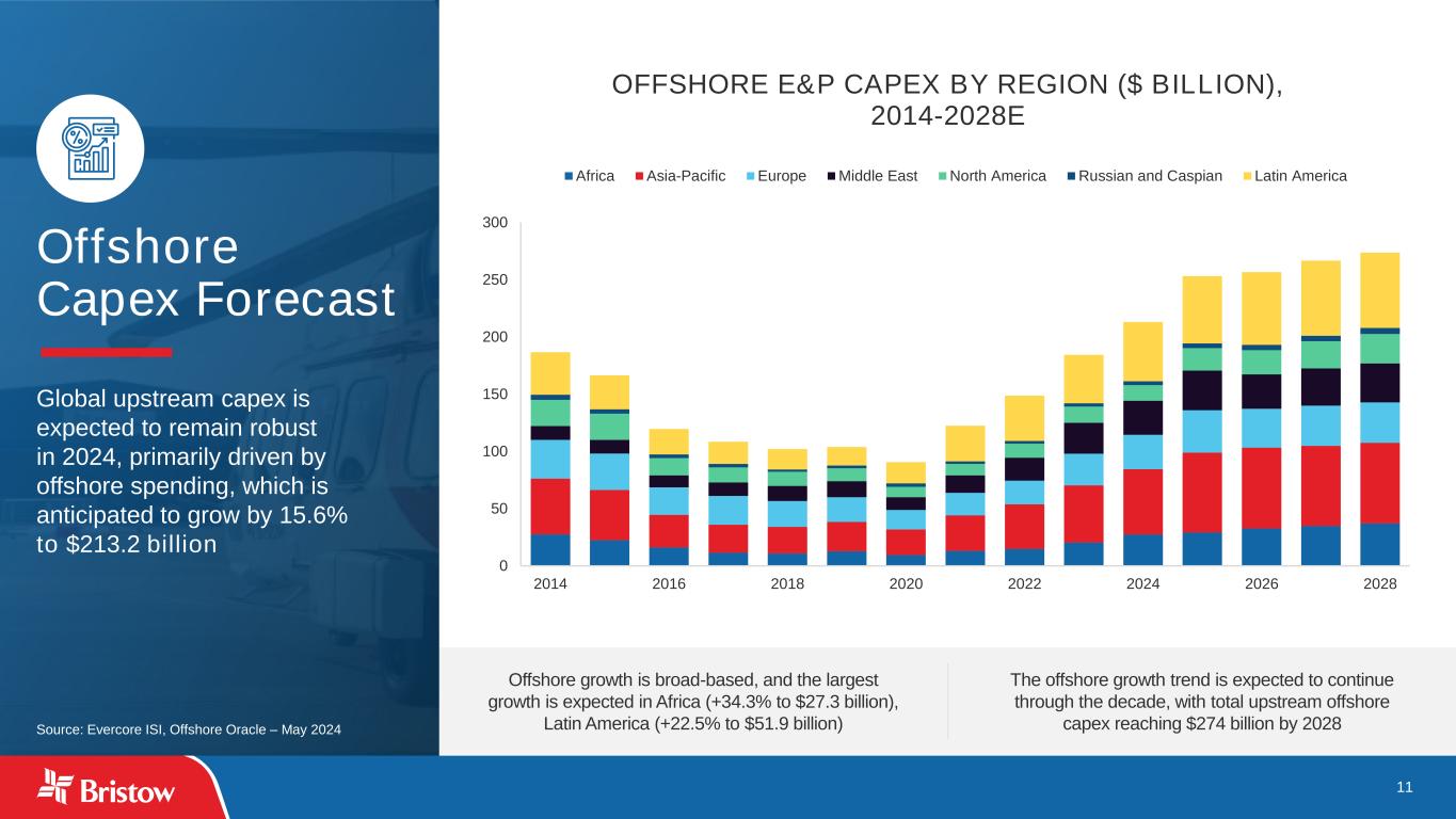 10 Strong Balance Sheet and Liquidity Position Actual Amount Rate Maturity ($mm, as of 6/30/2024) Cash $182 ABL Facility ($85mm)(2) — SOFR+200 bps May-27 Senior Secured Notes 400 6.875% Mar-28 UKSAR Debt 187 SONIA+275 bps Mar-36 IRCG Debt 24 EURIBOR+195 bps Jun-31 Total Debt(2) $ 611 Less: Unrestricted Cash $ (179) Net Debt $ 432 Illustrative Annual Debt Maturity Profile (1) Balances reflected as of 6/30/2024. (2) Reflects principal balance of total debt (3) As of 6/30/2024, the ABL facility had $3.1 million in letters of credit drawn against it and availability of $67.8 million (4) The illustrative UKSAR Debt balance shown assumes a GBP/USD exchange rate of 1.27; assumes full utilization of £55mm facility announced in January 2024 (5) The IRCG Debt assumes a EUR/USD rate of 1.08, €99mm of the €100mm facility is drawn and that Bristow exercises the full two-year availability period followed by a five-year term. No principal payments are required during the availability period Unfunded capital commitments of $315.8 million, consisting primarily of aircraft purchases(1) $178.6 million of unrestricted cash and total liquidity of $246.4 million(1) $17 $19 $19 $19 $19 $19 $19 $19 $19 $19 $19 $19 $5 $11 $11 $11 $11 $11 $53 $400 $0 $100 $200 $300 $400 $500 2024 2025 2026 2027 2028 2029 2030 2031 2032 2033 2034 2035 2036 UKSAR Debt IRCG Debt ABL Facility Commitment Senior Secured Notes Entered into a long-term equipment financing for up to €100 million at attractive rates. The credit facility is expected to fund during 2024 and will support obligations under the IRCG contract. The Company has drawn €46 million to date under this facility Funded approximately £26 million of previously announced £55 million upsizing of UKSAR Debt