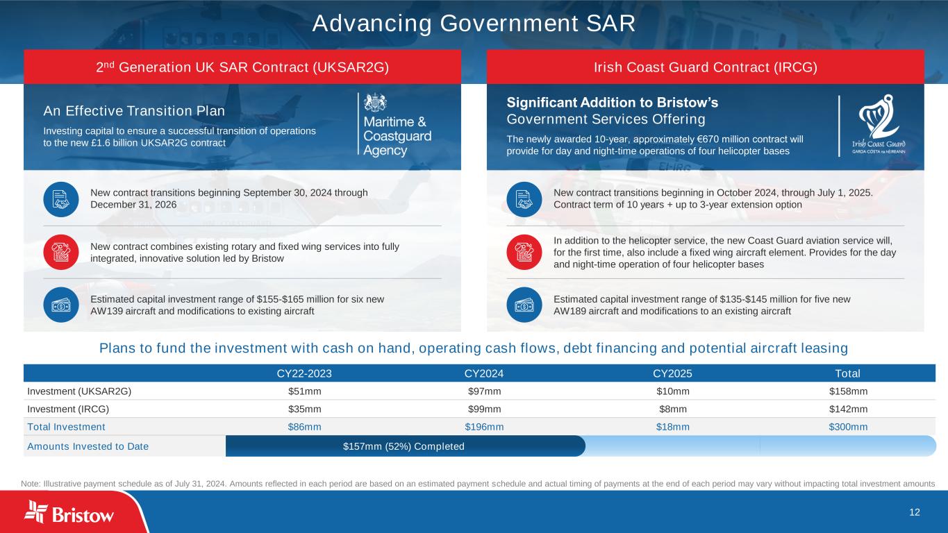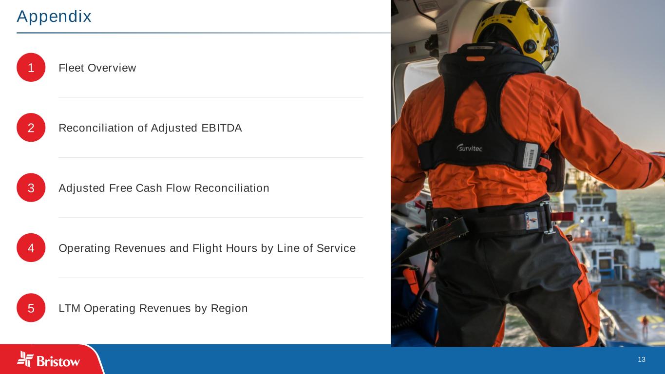 12 An Effective Transition Plan Investing capital to ensure a successful transition of operations to the new £1.6 billion UKSAR2G contract Significant Addition to Bristow’s Government Services Offering The newly awarded 10-year, approximately €670 million contract will provide for day and night-time operations of four helicopter bases Advancing Government SAR Note: Illustrative payment schedule as of July 31, 2024. Amounts reflected in each period are based on an estimated payment schedule and actual timing of payments at the end of each period may vary without impacting total investment amounts 2nd Generation UK SAR Contract (UKSAR2G) Irish Coast Guard Contract (IRCG) New contract transitions beginning September 30, 2024 through December 31, 2026 Estimated capital investment range of $155-$165 million for six new AW139 aircraft and modifications to existing aircraft New contract combines existing rotary and fixed wing services into fully integrated, innovative solution led by Bristow New contract transitions beginning in October 2024, through July 1, 2025. Contract term of 10 years + up to 3-year extension option Estimated capital investment range of $135-$145 million for five new AW189 aircraft and modifications to an existing aircraft In addition to the helicopter service, the new Coast Guard aviation service will, for the first time, also include a fixed wing aircraft element. Provides for the day and night-time operation of four helicopter bases Plans to fund the investment with cash on hand, operating cash flows, debt financing and potential aircraft leasing CY22-2023 CY2024 CY2025 Total Investment (UKSAR2G) $51mm $97mm $10mm $158mm Investment (IRCG) $35mm $99mm $8mm $142mm Total Investment $86mm $196mm $18mm $300mm Amounts Invested to Date $157mm (52%) Completed