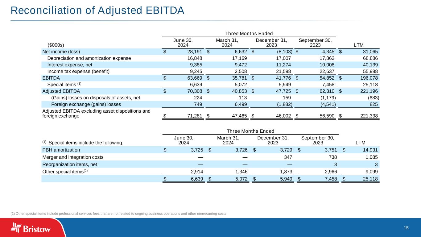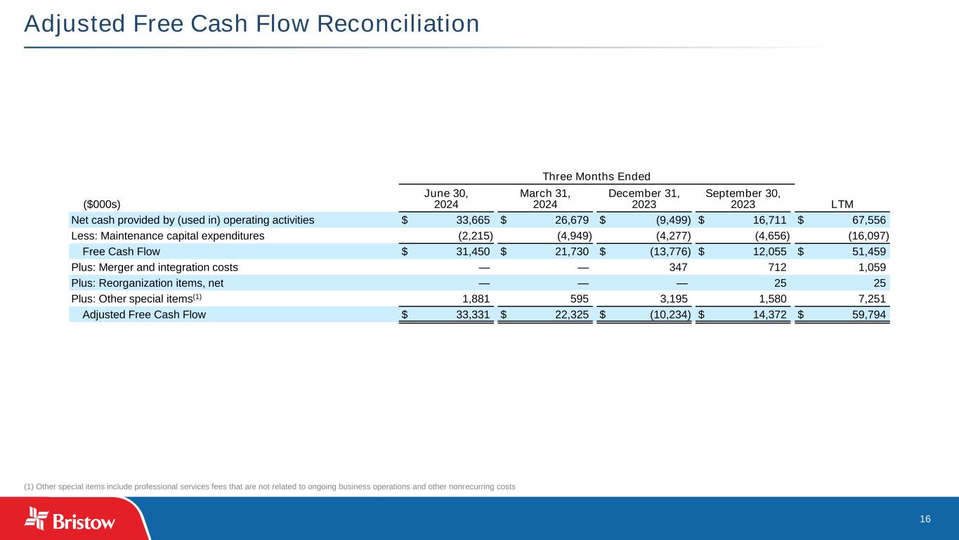 15 Reconciliation of Adjusted EBITDA (2) Other special items include professional services fees that are not related to ongoing business operations and other nonrecurring costs Three Months Ended ($000s) June 30, 2024 March 31, 2024 December 31, 2023 September 30, 2023 LTM Net income (loss) $ 28,191 $ 6,632 $ (8,103) $ 4,345 $ 31,065 Depreciation and amortization expense 16,848 17,169 17,007 17,862 68,886 Interest expense, net 9,385 9,472 11,274 10,008 40,139 Income tax expense (benefit) 9,245 2,508 21,598 22,637 55,988 EBITDA $ 63,669 $ 35,781 $ 41,776 $ 54,852 $ 196,078 Special items (1) 6,639 5,072 5,949 7,458 25,118 Adjusted EBITDA $ 70,308 $ 40,853 $ 47,725 $ 62,310 $ 221,196 (Gains) losses on disposals of assets, net 224 113 159 (1,179) (683) Foreign exchange (gains) losses 749 6,499 (1,882) (4,541) 825 Adjusted EBITDA excluding asset dispositions and foreign exchange $ 71,281 $ 47,465 $ 46,002 $ 56,590 $ 221,338 Three Months Ended (1) Special items include the following: June 30, 2024 March 31, 2024 December 31, 2023 September 30, 2023 LTM PBH amortization $ 3,725 $ 3,726 $ 3,729 $ 3,751 $ 14,931 Merger and integration costs — — 347 738 1,085 Reorganization items, net — — — 3 3 Other special items(2) 2,914 1,346 1,873 2,966 9,099 $ 6,639 $ 5,072 $ 5,949 $ 7,458 $ 25,118