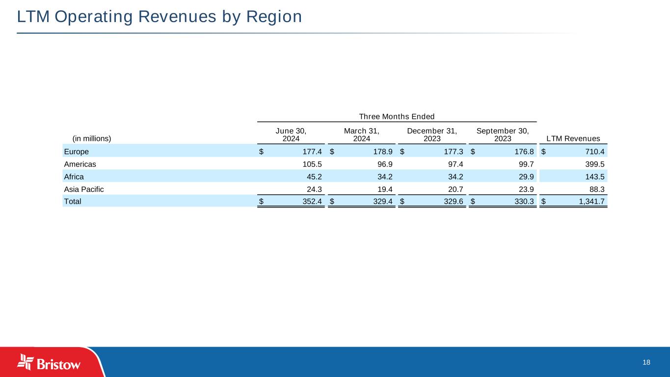 17 Operating Revenues and Flight Hours by Line of Service Three Months Ended June 30, 2024 March 31, 2024 December 31, 2023 September 30, 2023 LTM Operating revenues ($000s) Offshore energy services: Europe $ 99,741 $ 99,530 $ 99,066 $ 94,346 $ 392,683 Americas 97,752 88,515 89,200 91,099 366,566 Africa 40,998 32,653 31,695 27,545 132,891 Total offshore energy services 238,491 220,698 219,961 212,990 892,140 Government services 79,476 82,108 81,714 85,549 328,847 Fixed wing services 31,987 23,708 25,697 29,168 110,560 Other services 2,540 2,842 2,221 2,545 10,148 $ 352,494 $ 329,356 $ 329,593 $ 330,252 $ 1,341,695 Three Months Ended June 30, 2024 March 31, 2024 December 31, 2023 September 30, 2023 Flight hours by line of service Offshore energy services: Europe 9,826 9,488 10,412 10,783 Americas 11,028 10,048 10,105 9,767 Africa 4,594 3,683 3,938 3,572 Total offshore energy services 25,448 23,219 24,455 24,122 Government services 4,875 4,493 4,477 5,232 Fixed wing services 3,390 3,138 2,889 2,956 33,713 30,850 31,821 32,310