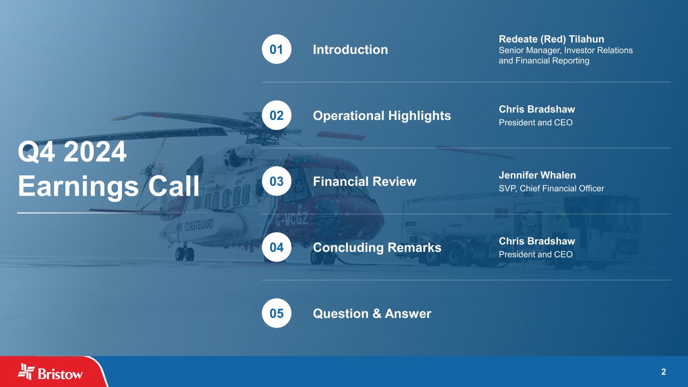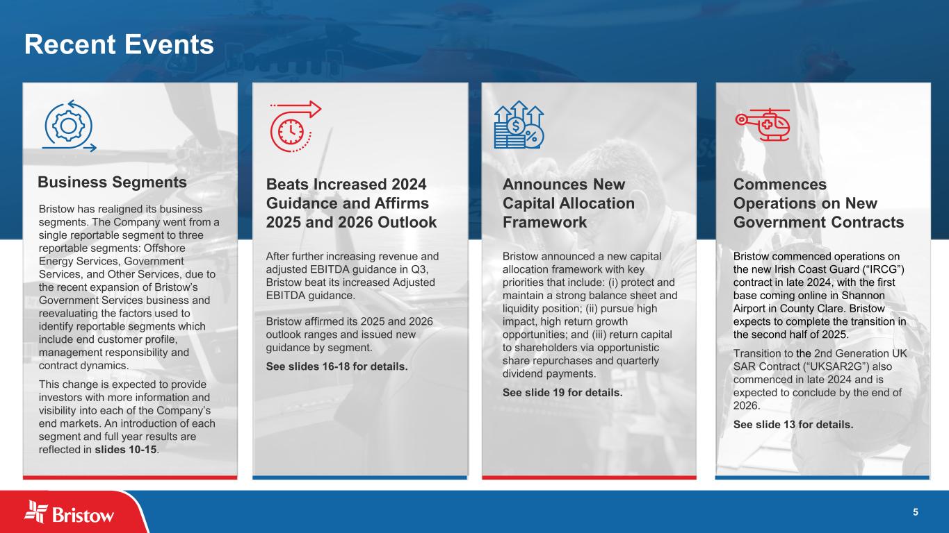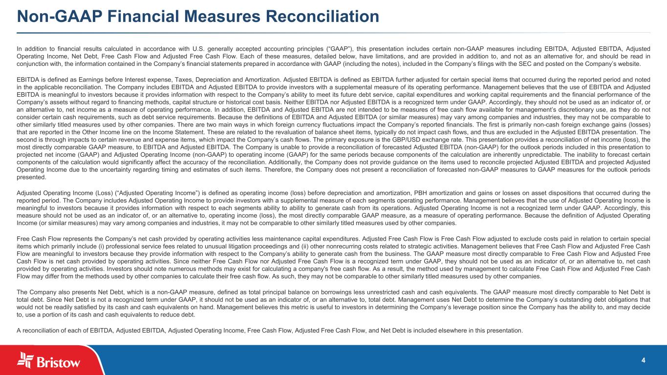 3 Cautionary Statement Regarding Forward-Looking Statements This presentation includes “forward-looking statements” within the meaning of Section 27A of the Securities Act of 1933, as amended, and Section 21E of the Securities Exchange Act of 1934, as amended. Forward- looking statements are statements about our future business, strategy, operations, capabilities and results; financial projections; plans and objectives of our management, including our expectations regarding a quarterly dividend program and our intention to pay down debt; expected actions by us and by third parties, including our customers, competitors, vendors and regulators, and other matters. Some of the forward-looking statements can be identified by the use of words such as “believes”, “belief”, “forecasts”, “expects”, “plans”, “anticipates”, “intends”, “projects”, “estimates”, “may”, “might”, “will”, “would”, “could”, “should” or other similar words; however, all statements in this presentation, other than statements of historical fact or historical financial results, are forward-looking statements. Our forward-looking statements reflect our views and assumptions on the date hereof regarding future events and operating performance. We believe that they are reasonable, but they involve significant known and unknown risks, uncertainties, assumptions and other factors, many of which may be beyond our control, that may cause actual results to differ materially from any future results, performance or achievements expressed or implied by the forward-looking statements. Such risks, uncertainties and factors that could cause or contribute to such differences, include, but are not limited to, those discussed in our Annual Report on Form 10-K, and in particular, the risks discussed in Part I, Item 1A, “Risk Factors” of such report and those discussed in other documents we file with the Securities and Exchange Commission (the “SEC”). Accordingly, you should not put undue reliance on any forward-looking statements. You should consider the following key factors when evaluating these forward-looking statements: the impact of supply chain disruptions and inflation and our ability to recoup rising costs in the rates we charge to our customers; our reliance on a limited number of helicopter manufacturers and suppliers and the impact of a shortfall in availability of aircraft components and parts required for maintenance and repairs of our helicopters, including significant delays in the delivery of parts for our S92 fleet; our reliance on a limited number of customers and the reduction of our customer base as a result of consolidation and/or the energy transition; public health crises, such as pandemics and epidemics, and any related government policies and actions; our inability to execute our business strategy for diversification efforts related to government services and advanced air mobility; the potential for cyberattacks or security breaches that could disrupt operations, compromise confidential or sensitive information, damage reputation, expose to legal liability, or cause financial losses; the possibility that we may be unable to maintain compliance with covenants in our financing agreements; global and regional changes in the demand, supply, prices or other market conditions affecting oil and gas, including changes resulting from a public health crisis or from the imposition or lifting of crude oil production quotas or other actions that might be imposed by the Organization of Petroleum Exporting Countries (OPEC) and other producing countries; fluctuations in the demand for our services; the possibility of significant changes in foreign exchange rates and controls; potential effects of increased competition and the introduction of alternative modes of transportation and solutions; the possibility that portions of our fleet may be grounded for extended periods of time or indefinitely (including due to severe weather events); the possibility of political instability, civil unrest, war or acts of terrorism in any of the countries where we operate or elsewhere; the possibility that we may be unable to re-deploy our aircraft to regions with greater demand; the existence of operating risks inherent in our business, including the possibility of declining safety performance; labor issues, including our inability to negotiate acceptable collective bargaining or union agreements with employees covered by such agreements; the possibility of changes in tax, environmental, trade, immigration and other laws and regulations and policies, including, without limitation, tariffs and actions of the governments that impact oil and gas operations, favor renewable energy projects or address climate change; any failure to effectively manage, and receive anticipated returns from, acquisitions, divestitures, investments, joint ventures and other portfolio actions; the possibility that we may be unable to dispose of older aircraft through sales into the aftermarket; the possibility that we may impair our long-lived assets and other assets, including inventory, property and equipment and investments in unconsolidated affiliates; general economic conditions, including interest rates or uncertainty in the capital and credit markets; the possibility that reductions in spending on aviation services by governmental agencies where we are seeking contracts could adversely affect or lead to modifications of the procurement process or that such reductions in spending could adversely affect search and rescue (“SAR”) contract terms or otherwise delay service or the receipt of payments under such contracts; and, the effectiveness of our environmental, social and governance initiatives. The above description of risks and uncertainties is by no means all-inclusive, but is designed to highlight what we believe are important factors to consider. All forward-looking statements in this presen