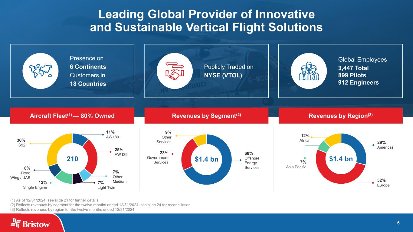 5 Recent Events After further increasing revenue and adjusted EBITDA guidance in Q3, Bristow beat its increased Adjusted EBITDA guidance. Bristow affirmed its 2025 and 2026 outlook ranges and issued new guidance by segment. See slides 16-18 for details. Beats Increased 2024 Guidance and Affirms 2025 and 2026 Outlook Announces New Capital Allocation Framework Bristow announced a new capital allocation framework with key priorities that include: (i) protect and maintain a strong balance sheet and liquidity position; (ii) pursue high impact, high return growth opportunities; and (iii) return capital to shareholders via opportunistic share repurchases and quarterly dividend payments. See slide 19 for details. Bristow has realigned its business segments. The Company went from a single reportable segment to three reportable segments: Offshore Energy Services, Government Services, and Other Services, due to the recent expansion of Bristow’s Government Services business and reevaluating the factors used to identify reportable segments which include end customer profile, management responsibility and contract dynamics. This change is expected to provide investors with more information and visibility into each of the Company’s end markets. An introduction of each segment and full year results are reflected in slides 10-15. Business Segments Commences Operations on New Government Contracts Bristow commenced operations on the new Irish Coast Guard (“IRCG”) contract in late 2024, with the first base coming online in Shannon Airport in County Clare. Bristow expects to complete the transition in the second half of 2025. Transition to the 2nd Generation UK SAR Contract (“UKSAR2G”) also commenced in late 2024 and is expected to conclude by the end of 2026. See slide 13 for details.