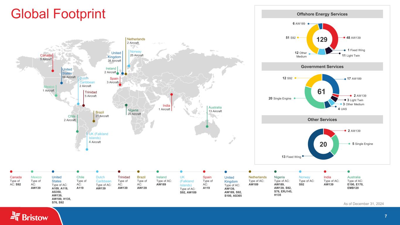 7 Canada 5 Aircraft United States 66 Aircraft Mexico 1 Aircraft Dutch Caribbean 2 Aircraft Trinidad 5 Aircraft UK (Falkland Islands) 4 Aircraft Brazil 21 AircraftChile 2 Aircraft Australia 13 Aircraft India 1 Aircraft Netherlands 2 Aircraft Norway 25 Aircraft United Kingdom 38 Aircraft Nigeria 20 Aircraft Spain 3 Aircraft Ireland 2 Aircraft Canada Type of AC: S92 Mexico Type of AC: AW139 United States Type of AC: A109, A119, AS350, AW139, AW189, H135, S76, S92 Chile Type of AC: A119 Dutch Caribbean Type of AC: AW139 Trinidad Type of AC: AW139 Brazil Type of AC: AW139 Ireland Type of AC: AW189 UK (Falkland Islands) Type of AC: S92, AW189 Spain Type of AC: A119 United Kingdom Type of AC: AW139, AW189, S92, S100, AS365 Netherlands Type of AC: AW189 Nigeria Type of AC: AW189, AW139, S92, S76, ERJ145, H135 Norway Type of AC: S92 India Type of AC: AW139 Australia Type of AC: E190, E170, EMB120 Global Footprint As of December 31, 2024 Offshore Energy Services 11 Light Twin 1 Fixed Wing 51 S92 6 AW189 129 48 AW139 12 Other Medium Government Services Other Services 5 Single Engine20 2 AW139 13 Fixed Wing 17 AW189 61 2 AW139 12 S92 20 Single Engine 3 Light Twin 4 UAS 3 Other Medium