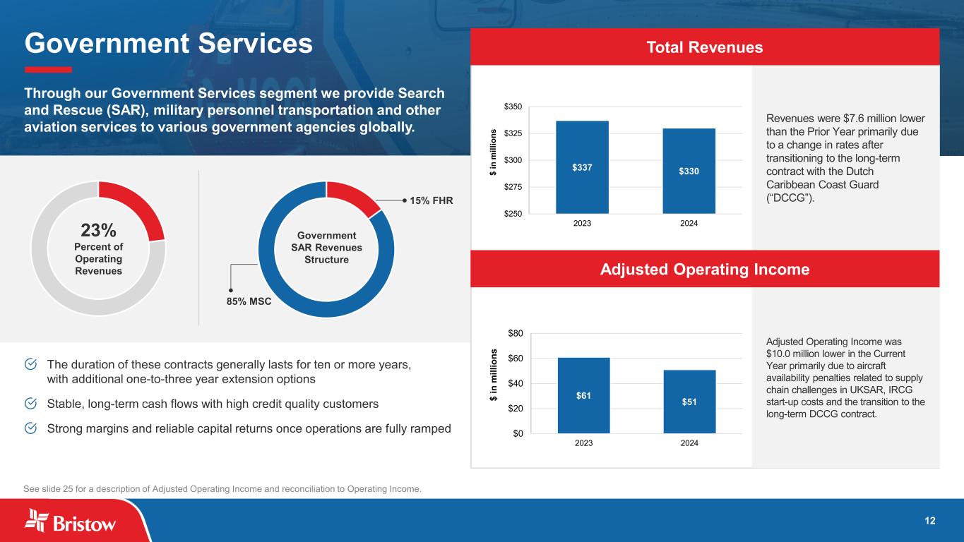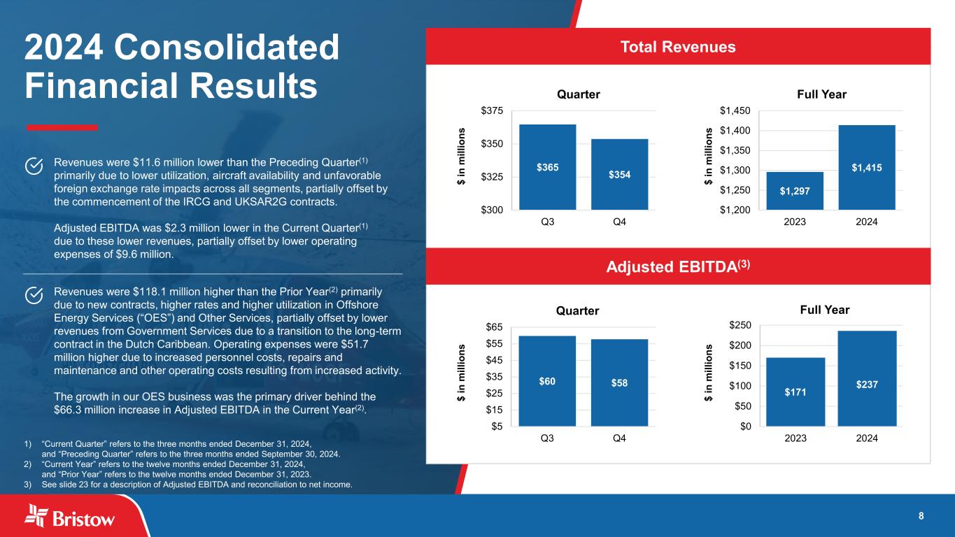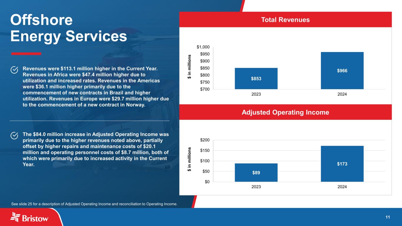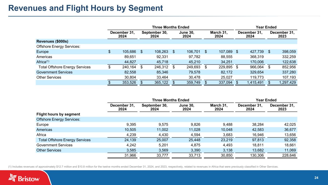 24 Revenues and Flight Hours by Segment Three Months Ended Year Ended December 31, 2024 September 30, 2024 June 30, 2024 March 31, 2024 December 31, 2024 December 31, 2023 Revenues ($000s) Offshore Energy Services: Europe $ 105,686 $ 108,263 $ 106,701 $ 107,089 $ 427,739 $ 398,059 Americas 89,651 92,331 97,782 88,555 368,319 332,259 Africa(1) 44,827 45,718 45,210 34,251 170,006 122,638 Total Offshore Energy Services $ 240,164 $ 246,312 $ 249,693 $ 229,895 $ 966,064 $ 852,956 Government Services 82,558 85,346 79,578 82,172 329,654 337,280 Other Services 30,804 33,464 30,478 25,027 119,773 107,193 $ 353,526 $ 365,122 $ 359,749 $ 337,094 $ 1,415,491 $ 1,297,429 Three Months Ended Year Ended December 31, 2024 September 30, 2024 June 30, 2024 March 31, 2024 December 31, 2024 December 31, 2023 Flight hours by segment Offshore Energy Services: Europe 9,395 9,575 9,826 9,488 38,284 42,025 Americas 10,505 11,002 11,028 10,048 42,583 36,677 Africa 4,239 4,430 4,594 3,683 16,946 13,656 Total Offshore Energy Services 24,139 25,007 25,448 23,219 97,813 92,358 Government Services 4,242 5,201 4,875 4,493 18,811 18,661 Other Services 3,585 3,569 3,390 3,138 13,682 11,069 31,966 33,777 33,713 30,850 130,306 228,646 (1) Includes revenues of approximately $12.7 million and $10.8 million for the twelve months ended December 31, 2024, and 2023, respectively, related to revenues in Africa that were previously classified in Other Services.