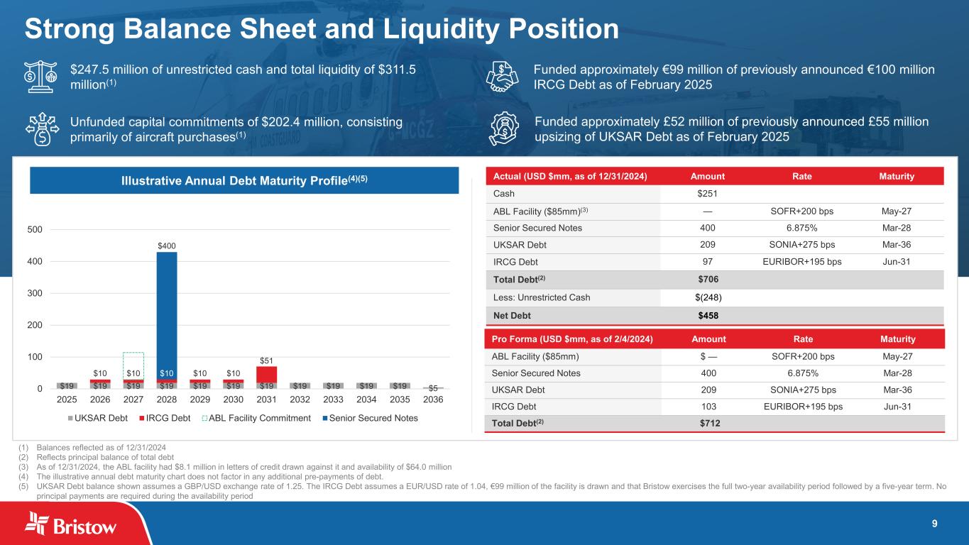 8 2024 Consolidated Financial Results 1) “Current Quarter” refers to the three months ended December 31, 2024, and “Preceding Quarter” refers to the three months ended September 30, 2024. 2) “Current Year” refers to the twelve months ended December 31, 2024, and “Prior Year” refers to the twelve months ended December 31, 2023. 3) See slide 23 for a description of Adjusted EBITDA and reconciliation to net income. Revenues were $11.6 million lower than the Preceding Quarter(1) primarily due to lower utilization, aircraft availability and unfavorable foreign exchange rate impacts across all segments, partially offset by the commencement of the IRCG and UKSAR2G contracts. Adjusted EBITDA was $2.3 million lower in the Current Quarter(1) due to these lower revenues, partially offset by lower operating expenses of $9.6 million. Total Revenues Adjusted EBITDA(3) Revenues were $118.1 million higher than the Prior Year(2) primarily due to new contracts, higher rates and higher utilization in Offshore Energy Services (“OES”) and Other Services, partially offset by lower revenues from Government Services due to a transition to the long-term contract in the Dutch Caribbean. Operating expenses were $51.7 million higher due to increased personnel costs, repairs and maintenance and other operating costs resulting from increased activity. The growth in our OES business was the primary driver behind the $66.3 million increase in Adjusted EBITDA in the Current Year(2). $365 $354 $300 $325 $350 $375 Q3 Q4 $ in m ill io ns Quarter $1,297 $1,415 $1,200 $1,250 $1,300 $1,350 $1,400 $1,450 2023 2024 $ in m ill io ns Full Year $60 $58 $5 $15 $25 $35 $45 $55 $65 Q3 Q4 $ in m ill io ns Quarter $171 $237 $0 $50 $100 $150 $200 $250 2023 2024 $ in m ill io ns Full Year