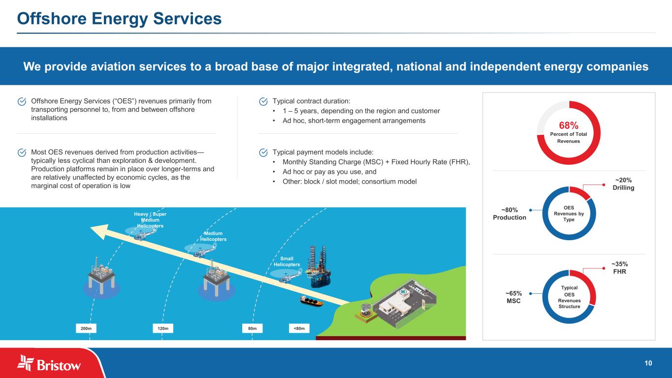 9 Strong Balance Sheet and Liquidity Position Actual (USD $mm, as of 12/31/2024) Amount Rate Maturity Cash $251 ABL Facility ($85mm)(3) — SOFR+200 bps May-27 Senior Secured Notes 400 6.875% Mar-28 UKSAR Debt 209 SONIA+275 bps Mar-36 IRCG Debt 97 EURIBOR+195 bps Jun-31 Total Debt(2) $706 Less: Unrestricted Cash $(248) Net Debt $458 Illustrative Annual Debt Maturity Profile(4)(5) (1) Balances reflected as of 12/31/2024 (2) Reflects principal balance of total debt (3) As of 12/31/2024, the ABL facility had $8.1 million in letters of credit drawn against it and availability of $64.0 million (4) The illustrative annual debt maturity chart does not factor in any additional pre-payments of debt. (5) UKSAR Debt balance shown assumes a GBP/USD exchange rate of 1.25. The IRCG Debt assumes a EUR/USD rate of 1.04, €99 million of the facility is drawn and that Bristow exercises the full two-year availability period followed by a five-year term. No principal payments are required during the availability period $19 $19 $19 $19 $19 $19 $19 $19 $19 $19 $19 $5 $10 $10 $10 $10 $10 $51 $400 0 100 200 300 400 500 2025 2026 2027 2028 2029 2030 2031 2032 2033 2034 2035 2036 UKSAR Debt IRCG Debt ABL Facility Commitment Senior Secured Notes Unfunded capital commitments of $202.4 million, consisting primarily of aircraft purchases(1) Funded approximately £52 million of previously announced £55 million upsizing of UKSAR Debt as of February 2025 $247.5 million of unrestricted cash and total liquidity of $311.5 million(1) Funded approximately €99 million of previously announced €100 million IRCG Debt as of February 2025 Pro Forma (USD $mm, as of 2/4/2024) Amount Rate Maturity ABL Facility ($85mm) $ — SOFR+200 bps May-27 Senior Secured Notes 400 6.875% Mar-28 UKSAR Debt 209 SONIA+275 bps Mar-36 IRCG Debt 103 EURIBOR+195 bps Jun-31 Total Debt(2) $712