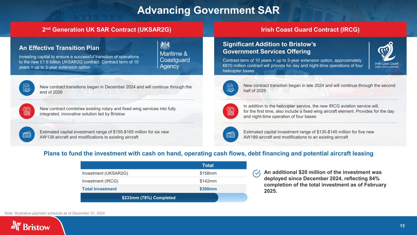 12 Government Services See slide 25 for a description of Adjusted Operating Income and reconciliation to Operating Income. Through our Government Services segment we provide Search and Rescue (SAR), military personnel transportation and other aviation services to various government agencies globally. The duration of these contracts generally lasts for ten or more years, with additional one-to-three year extension options Stable, long-term cash flows with high credit quality customers Strong margins and reliable capital returns once operations are fully ramped 23% Percent of Operating Revenues Government SAR Revenues Structure 85% MSC 15% FHR Revenues were $7.6 million lower than the Prior Year primarily due to a change in rates after transitioning to the long-term contract with the Dutch Caribbean Coast Guard (“DCCG”). Adjusted Operating Income was $10.0 million lower in the Current Year primarily due to aircraft availability penalties related to supply chain challenges in UKSAR, IRCG start-up costs and the transition to the long-term DCCG contract. Total Revenues Adjusted Operating Income $337 $330 $250 $275 $300 $325 $350 2023 2024 $ in m ill io ns $61 $51 $0 $20 $40 $60 $80 2023 2024 $ in m ill io ns