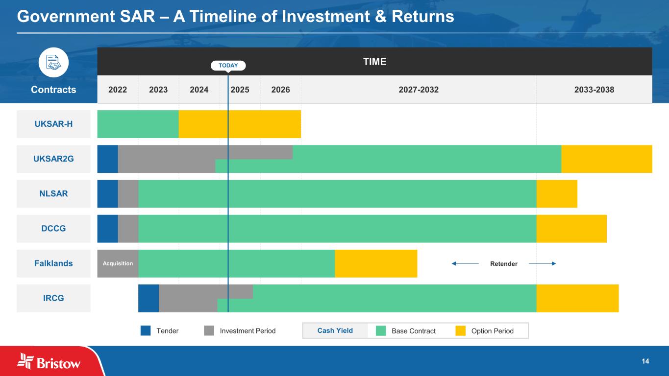 13 An Effective Transition Plan Investing capital to ensure a successful transition of operations to the new £1.6 billion UKSAR2G contract. Contract term of 10 years + up to 3-year extension option Significant Addition to Bristow’s Government Services Offering Contract term of 10 years + up to 3-year extension option, approximately €670 million contract will provide for day and night-time operations of four helicopter bases Advancing Government SAR Note: Illustrative payment schedule as of December 31, 2024 2nd Generation UK SAR Contract (UKSAR2G) Irish Coast Guard Contract (IRCG) New contract transitions began in December 2024 and will continue through the end of 2026 Estimated capital investment range of $155-$165 million for six new AW139 aircraft and modifications to existing aircraft New contract combines existing rotary and fixed wing services into fully integrated, innovative solution led by Bristow New contract transition began in late 2024 and will continue through the second half of 2025 Estimated capital investment range of $135-$145 million for five new AW189 aircraft and modifications to an existing aircraft In addition to the helicopter service, the new IRCG aviation service will, for the first time, also include a fixed wing aircraft element. Provides for the day and night-time operation of four bases Plans to fund the investment with cash on hand, operating cash flows, debt financing and potential aircraft leasing Total Investment (UKSAR2G) $158mm Investment (IRCG) $142mm Total Investment $300mm $233mm (78%) Completed An additional $20 million of the investment was deployed since December 2024, reflecting 84% completion of the total investment as of February 2025.