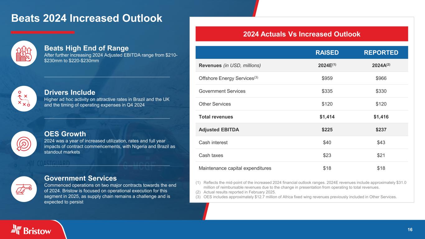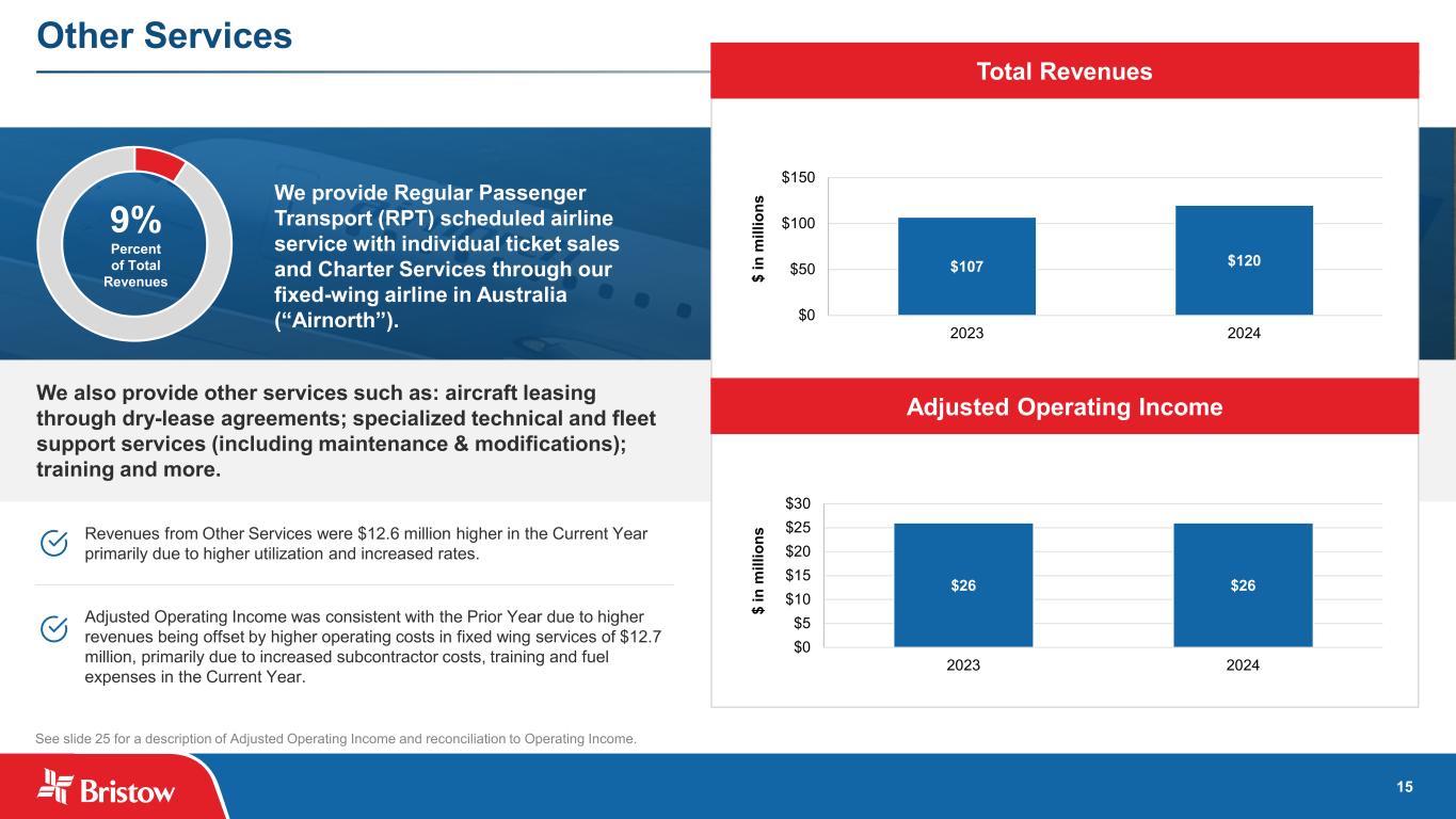 15 Other Services Revenues from Other Services were $12.6 million higher in the Current Year primarily due to higher utilization and increased rates. Adjusted Operating Income was consistent with the Prior Year due to higher revenues being offset by higher operating costs in fixed wing services of $12.7 million, primarily due to increased subcontractor costs, training and fuel expenses in the Current Year. $107 $120 $0 $50 $100 $150 2023 2024 $ in m ill io ns $26 $26 $0 $5 $10 $15 $20 $25 $30 2023 2024 $ in m ill io ns Total Revenues Adjusted Operating Income 9% Percent of Total Revenues We provide Regular Passenger Transport (RPT) scheduled airline service with individual ticket sales and Charter Services through our fixed-wing airline in Australia (“Airnorth”). We also provide other services such as: aircraft leasing through dry-lease agreements; specialized technical and fleet support services (including maintenance & modifications); training and more. See slide 25 for a description of Adjusted Operating Income and reconciliation to Operating Income.