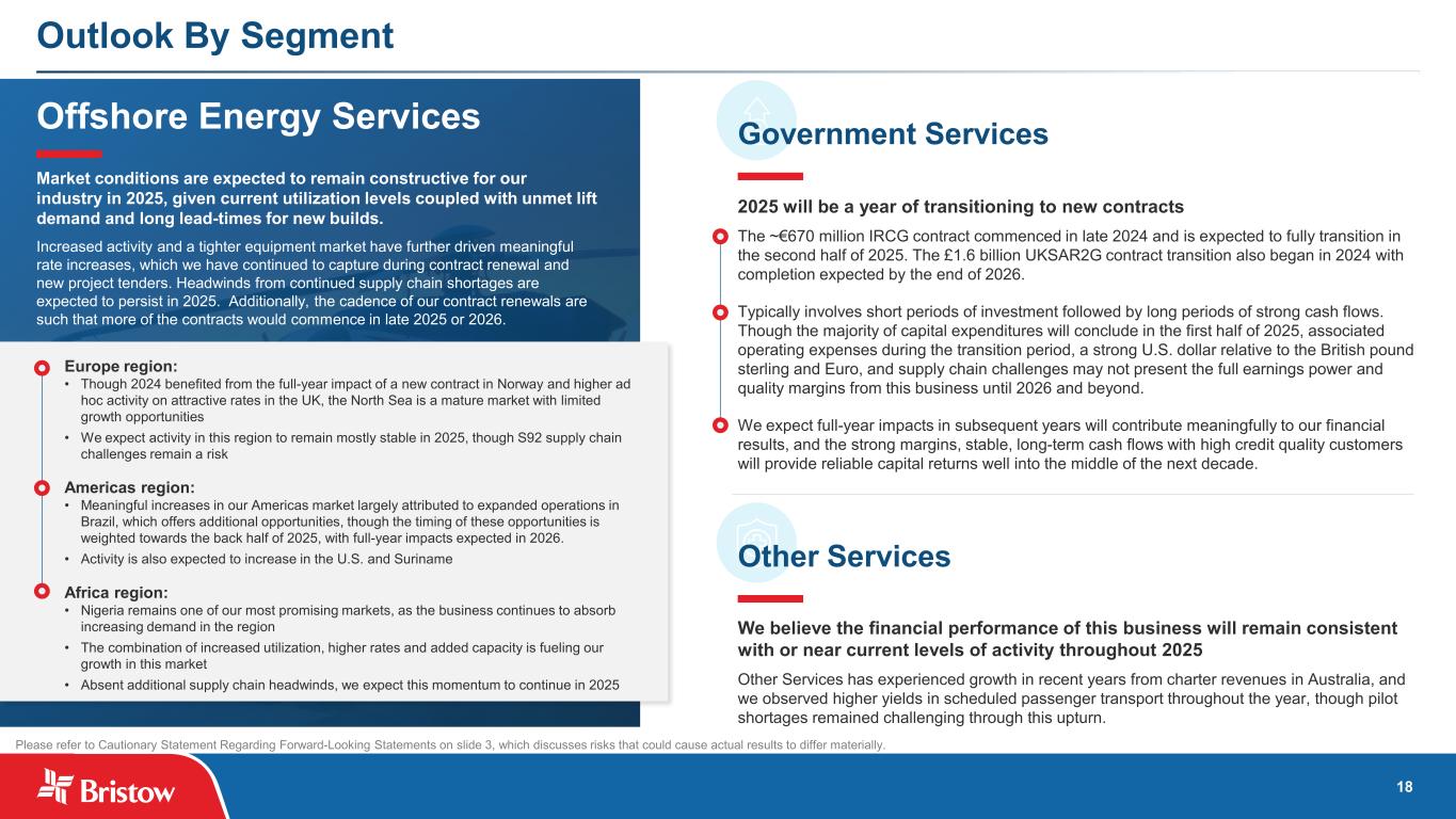 18 Outlook By Segment Please refer to Cautionary Statement Regarding Forward-Looking Statements on slide 3, which discusses risks that could cause actual results to differ materially. Offshore Energy Services Market conditions are expected to remain constructive for our industry in 2025, given current utilization levels coupled with unmet lift demand and long lead-times for new builds. Increased activity and a tighter equipment market have further driven meaningful rate increases, which we have continued to capture during contract renewal and new project tenders. Headwinds from continued supply chain shortages are expected to persist in 2025. Additionally, the cadence of our contract renewals are such that more of the contracts would commence in late 2025 or 2026. Europe region: • Though 2024 benefited from the full-year impact of a new contract in Norway and higher ad hoc activity on attractive rates in the UK, the North Sea is a mature market with limited growth opportunities • We expect activity in this region to remain mostly stable in 2025, though S92 supply chain challenges remain a risk Americas region: • Meaningful increases in our Americas market largely attributed to expanded operations in Brazil, which offers additional opportunities, though the timing of these opportunities is weighted towards the back half of 2025, with full-year impacts expected in 2026. • Activity is also expected to increase in the U.S. and Suriname Africa region: • Nigeria remains one of our most promising markets, as the business continues to absorb increasing demand in the region • The combination of increased utilization, higher rates and added capacity is fueling our growth in this market • Absent additional supply chain headwinds, we expect this momentum to continue in 2025 2025 will be a year of transitioning to new contracts The ~€670 million IRCG contract commenced in late 2024 and is expected to fully transition in the second half of 2025. The £1.6 billion UKSAR2G contract transition also began in 2024 with completion expected by the end of 2026. Typically involves short periods of investment followed by long periods of strong cash flows. Though the majority of capital expenditures will conclude in the first half of 2025, associated operating expenses during the transition period, a strong U.S. dollar relative to the British pound sterling and Euro, and supply chain challenges may not present the full earnings power and quality margins from this business until 2026 and beyond. We expect full-year impacts in subsequent years will contribute meaningfully to our financial results, and the strong margins, stable, long-term cash flows with high credit quality customers will provide reliable capital returns well into the middle of the next decade. Government Services We believe the financial performance of this business will remain consistent with or near current levels of activity throughout 2025 Other Services has experienced growth in recent years from charter revenues in Australia, and we observed higher yields in scheduled passenger transport throughout the year, though pilot shortages remained challenging through this upturn. Other Services